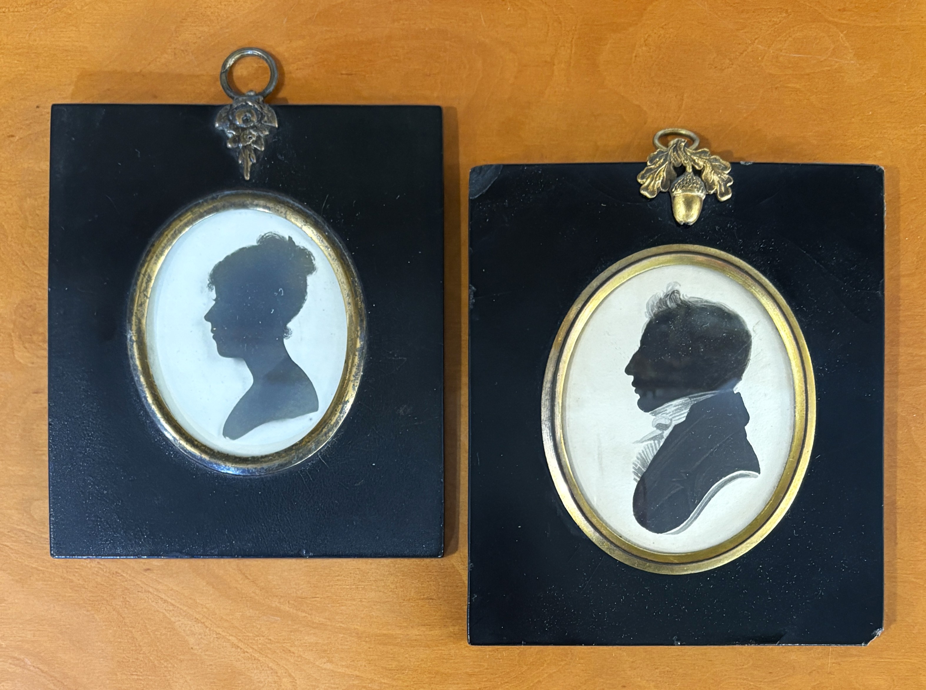 Two 19th century painted silhouette portrait studies, depicting a lady and a gentleman, oval, inset gilt metal mounted ebonised frames.