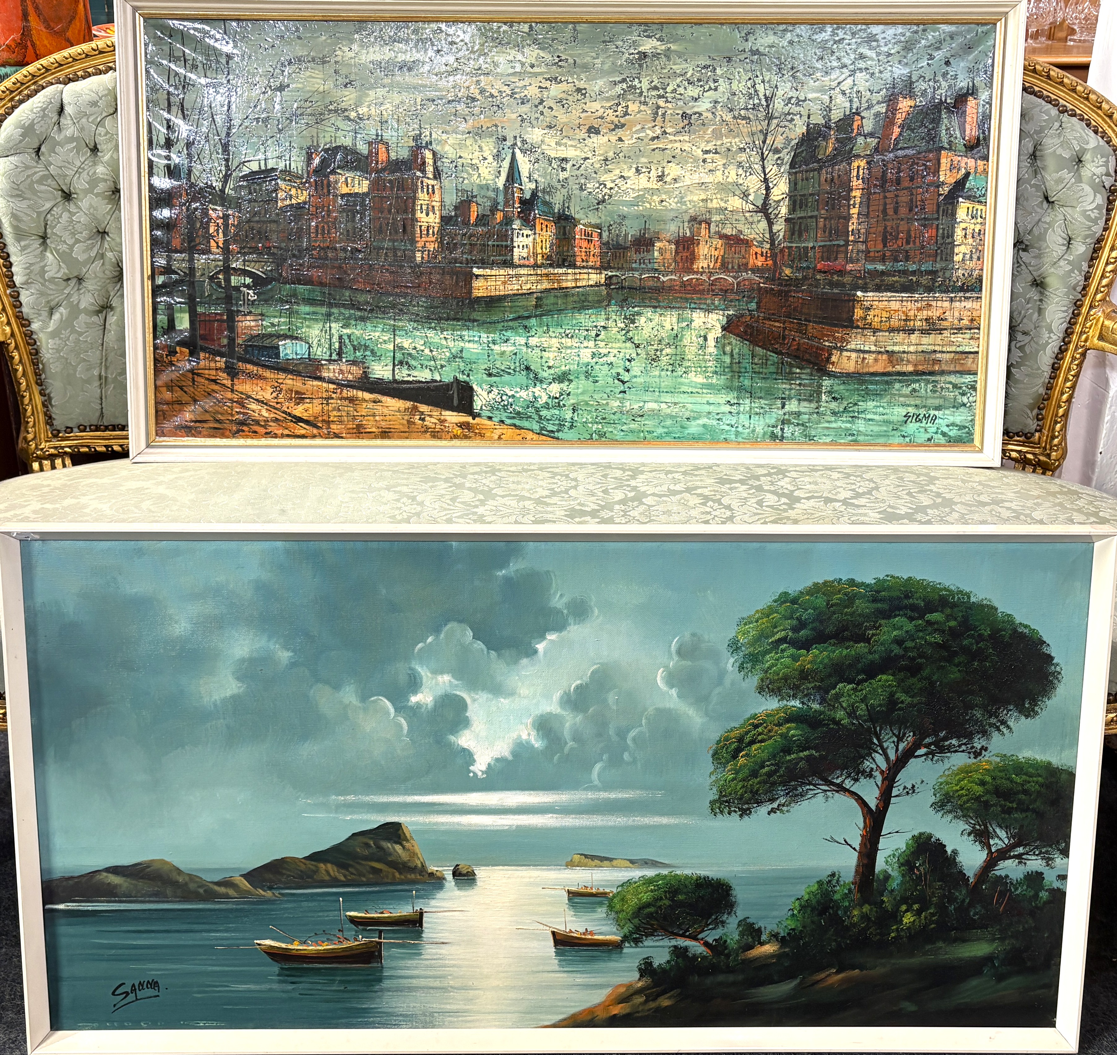 Continental School (Mid 20th Century), Two oils on canvas, including; Moonlit Seascape with Boats on the Water, signed 'Sanna' to the lower left, framed, 49.5cm by 101cm, together with a modernist scene of buildings on a river, possibly the Seine, signed 'Sigma' lower right, bearing 'The Armstrong Hope Gallery' label verso and inscribed 'Sigma - Paris', framed, 48.5cm by 101cm (2)