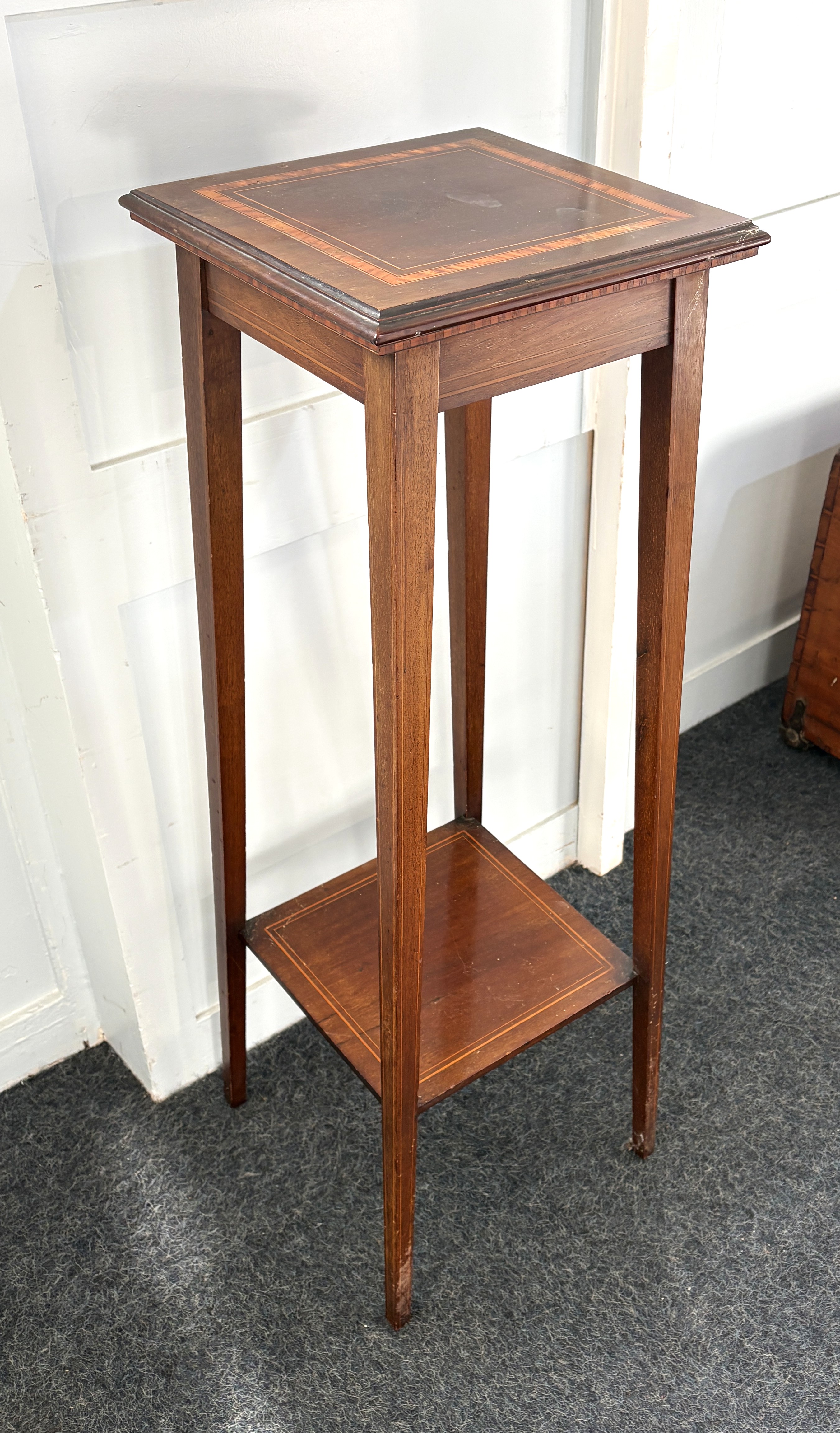 An Edwardian mahogany inlaid jardiniere stand with rectangular top and under tier on square tapered legs, top 31.5cm by 31cm, height 99.5cm