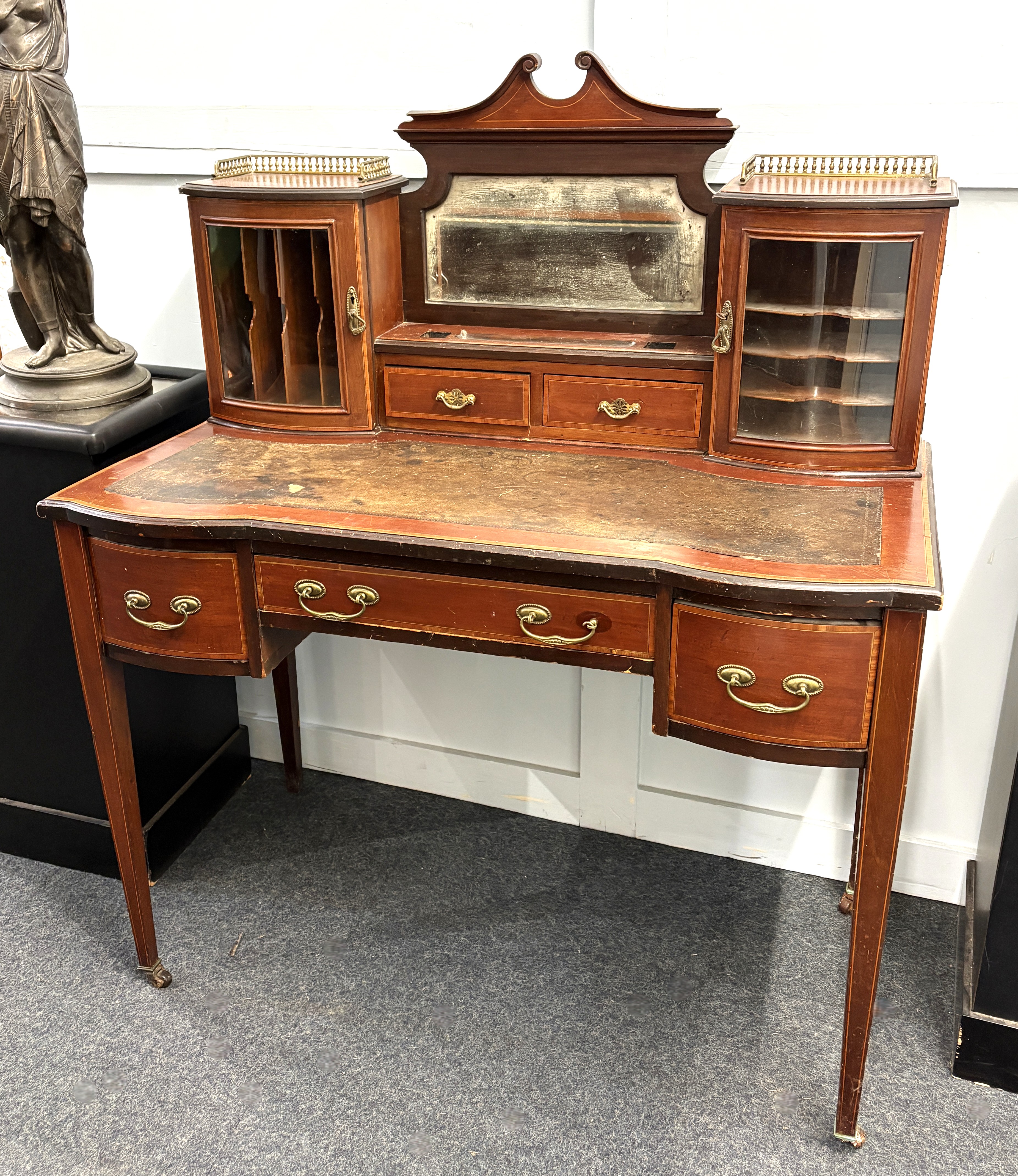 An Edwardian mahogany inlaid bonheur du jour / ladies writing desk, with bevelled rectangular mirror above two small drawers and flanked by two curved glazed panel doors, shaped rectangular top with inset writing surface above an arrangement of three further drawers, on tapered square legs and castors, height 117.5cm, width 98cm, depth 51cm