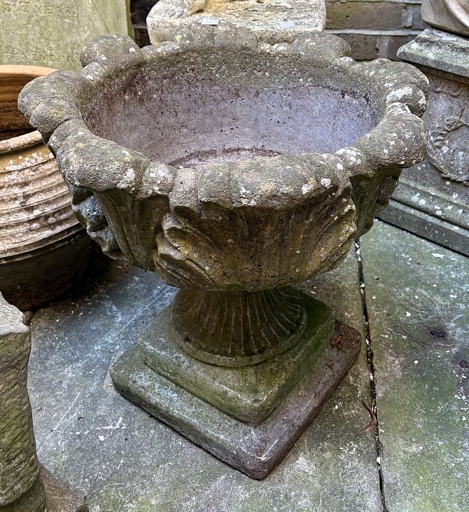 A Georgian style weathered reconstituted stone garden urn, 20th century, 50cm high.