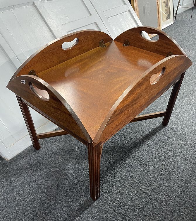 A Georgian style mahogany 'butler's tray' style coffee table, with hinged sides, raised on inner chamfered moulded square supports united by a cross stretcher, 82cm by 52cm opening to 102cm by 79cm,