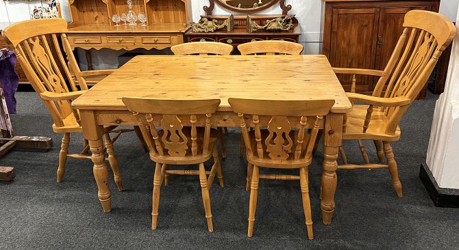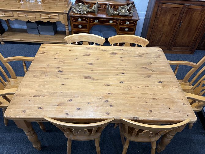 A matched Victorian style pine kitchen table with six chairs, 20th century: comprising a rectangular kitchen table with rounded corners and turned supports, 153cm by 108cm, a pair of Windsor style high back open sided armchairs, and a set of four Windsor style kitchen chairs, (7).