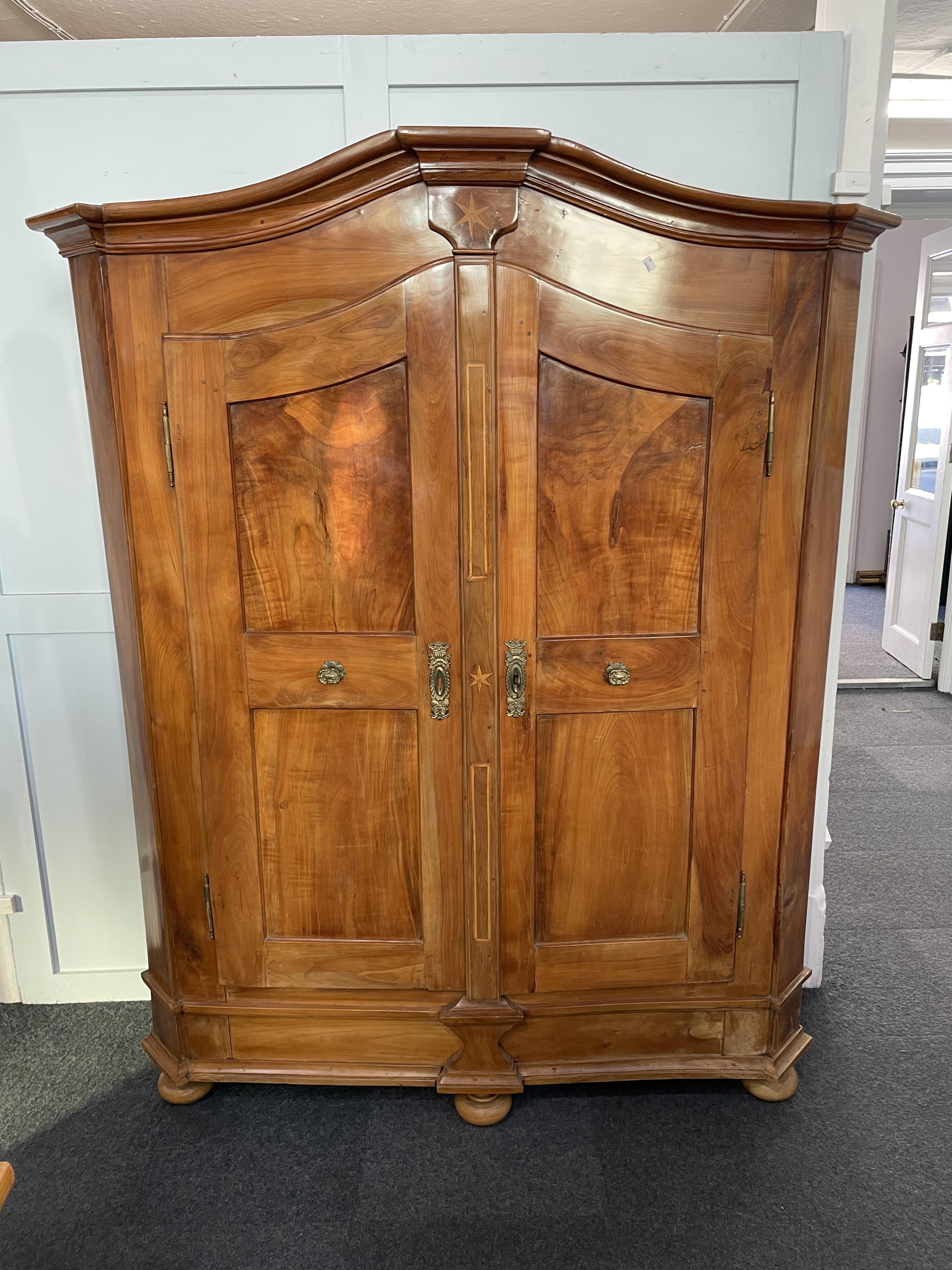 An 18th/19th century German inlaid walnut armoire, the two panelled doors applied with ornate cast gilt metal handles and escucheons, with original key, enclosing three shelves, raised on flat bun feet, 166cm wide by 198cm high.