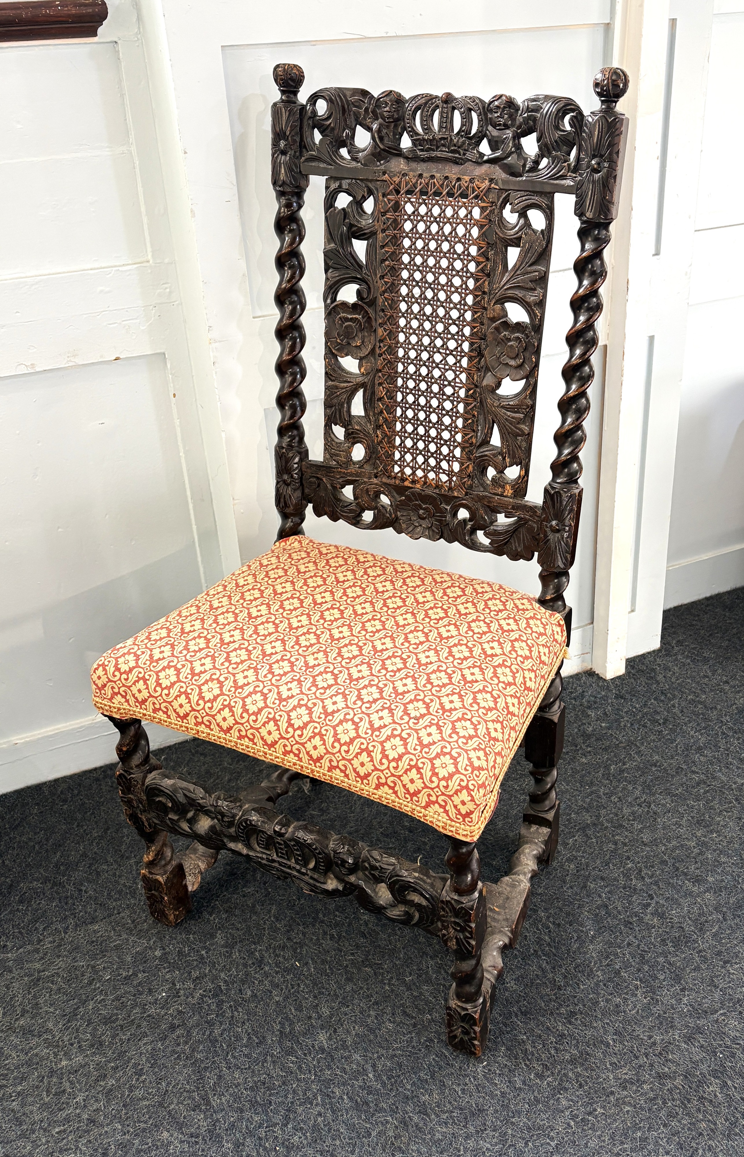 A Charles II style carved hall chair, the top rail and front splat with a crown flanked by two cherubs, cane panel back with spiral turned uprights, upholstered seat, on a spiral turned stretcher height 107.5cm