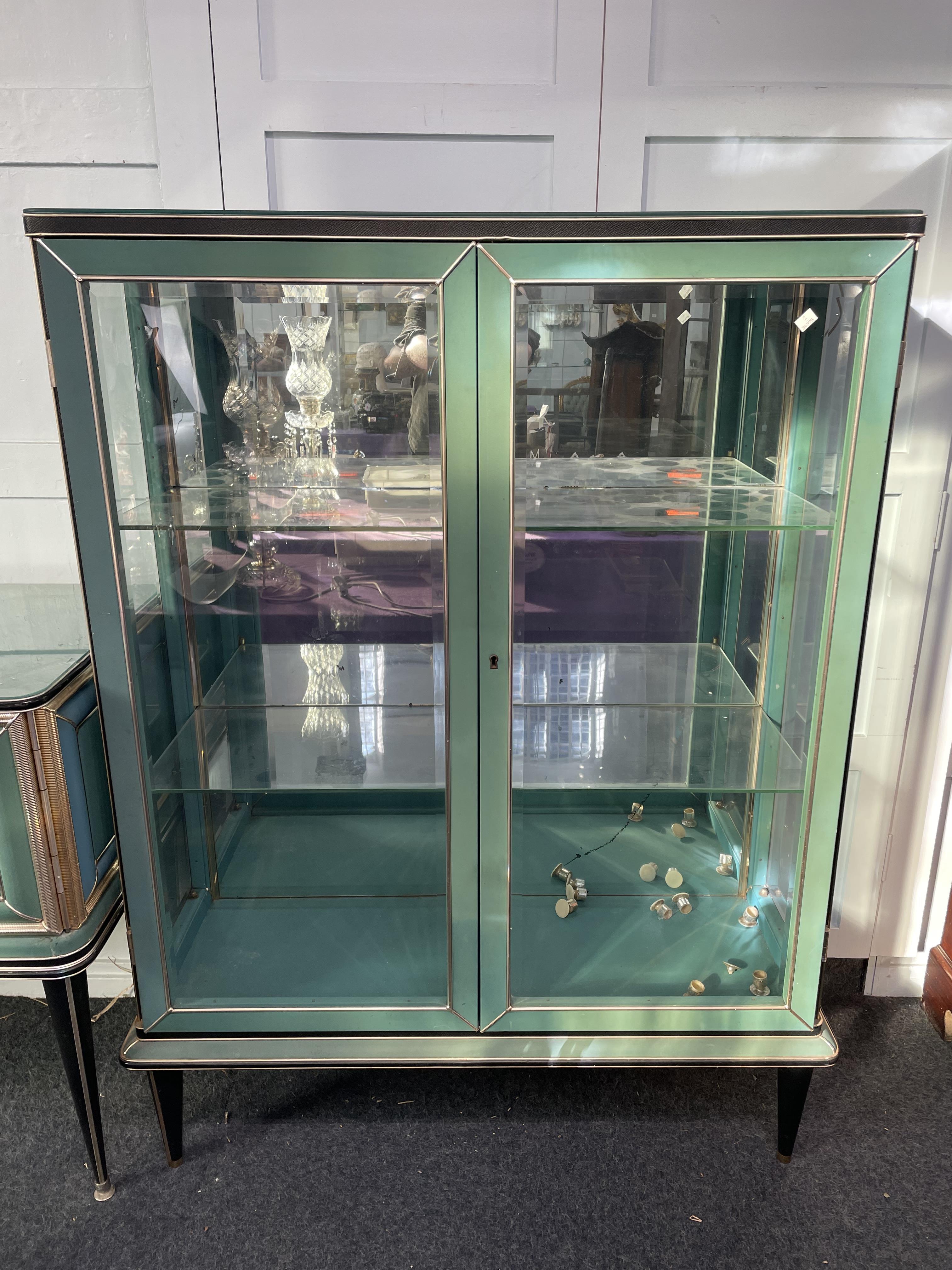 A mid 20th century Italian turquoise, ebonized and metal mounted display cabinet designed by Umberto Mascagni, with two glazed panel doors enclosing two glass shelves with mirror back, on tapered legs, height 153cm, width 111cm, depth 38cm