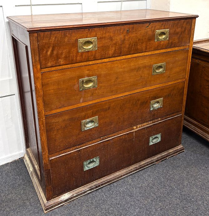 A 20th century Campaign style chest of four graduated drawers with brass flush handles on plinth base height 101cm, width 104cm, depth 50cm (a/f)
