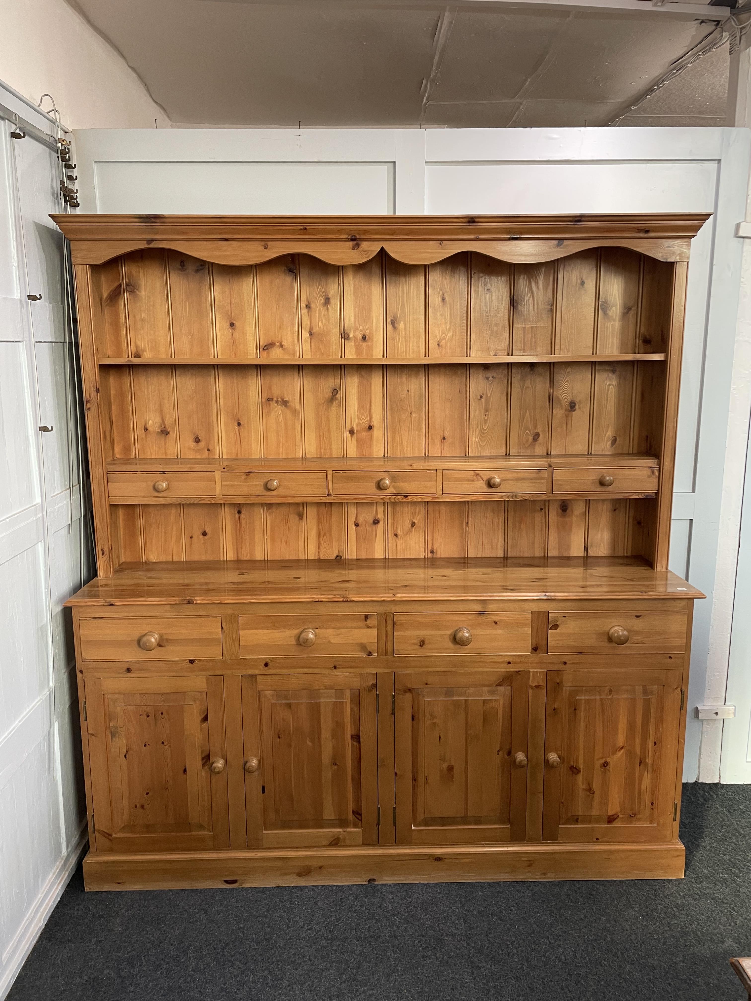 A Victorian style pine dresser, 20th century, the upper section with shaped canopy above shelves and five small drawers, the base section fitted with four frieze drawers above four panelled cupboard doors, raised on a plinth base, 183cm wide by 200cm high.