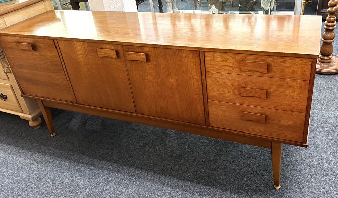 A c.1960's / 70's teak sideboard, fitted with two central cupboard doors enclosing storage space, flanked to one side by a drop down bar fitment, and on the other side by three graduated drawers, raised on tapered supports, 167cm wide by 44cm deep by 73cm high.