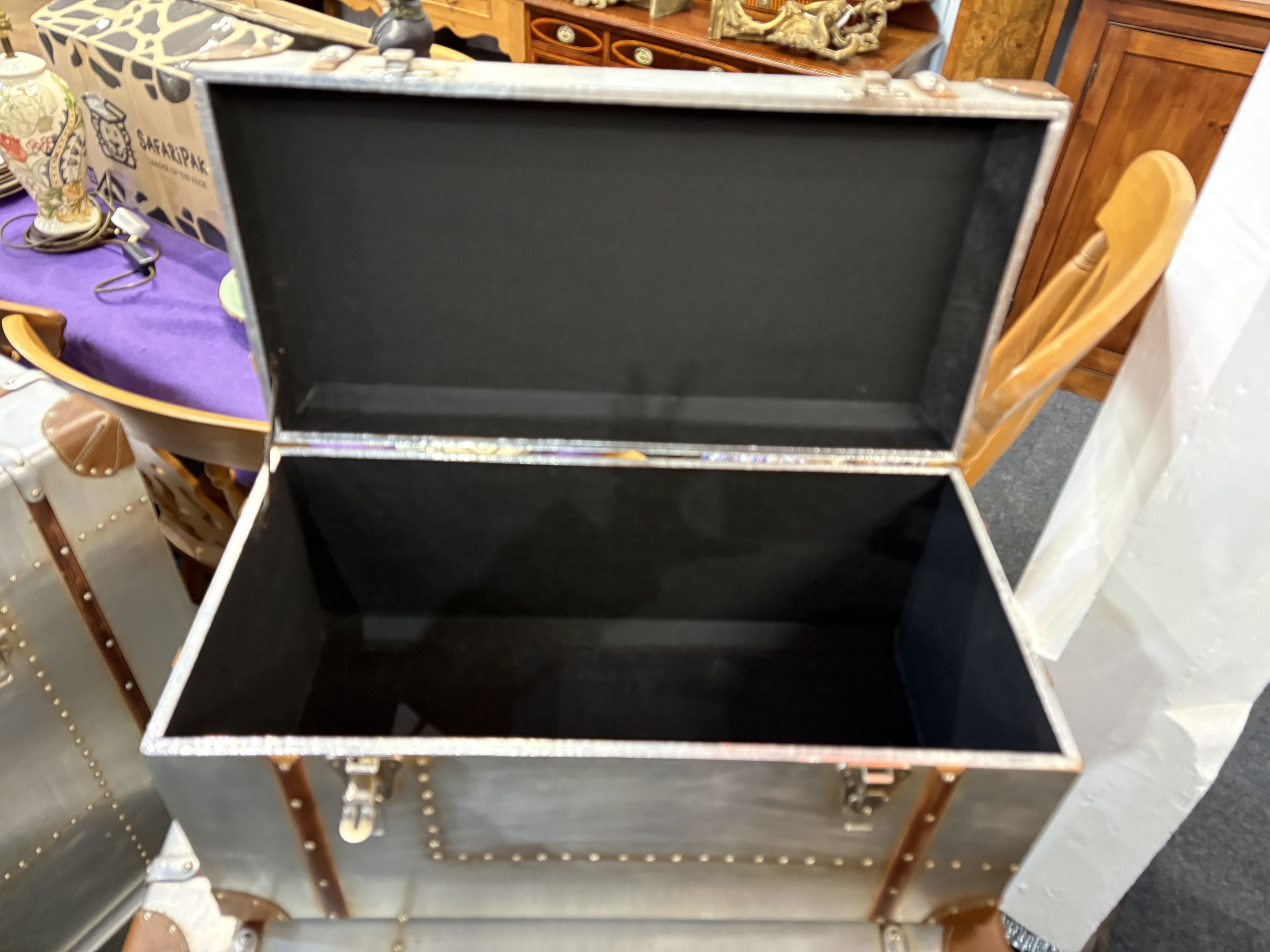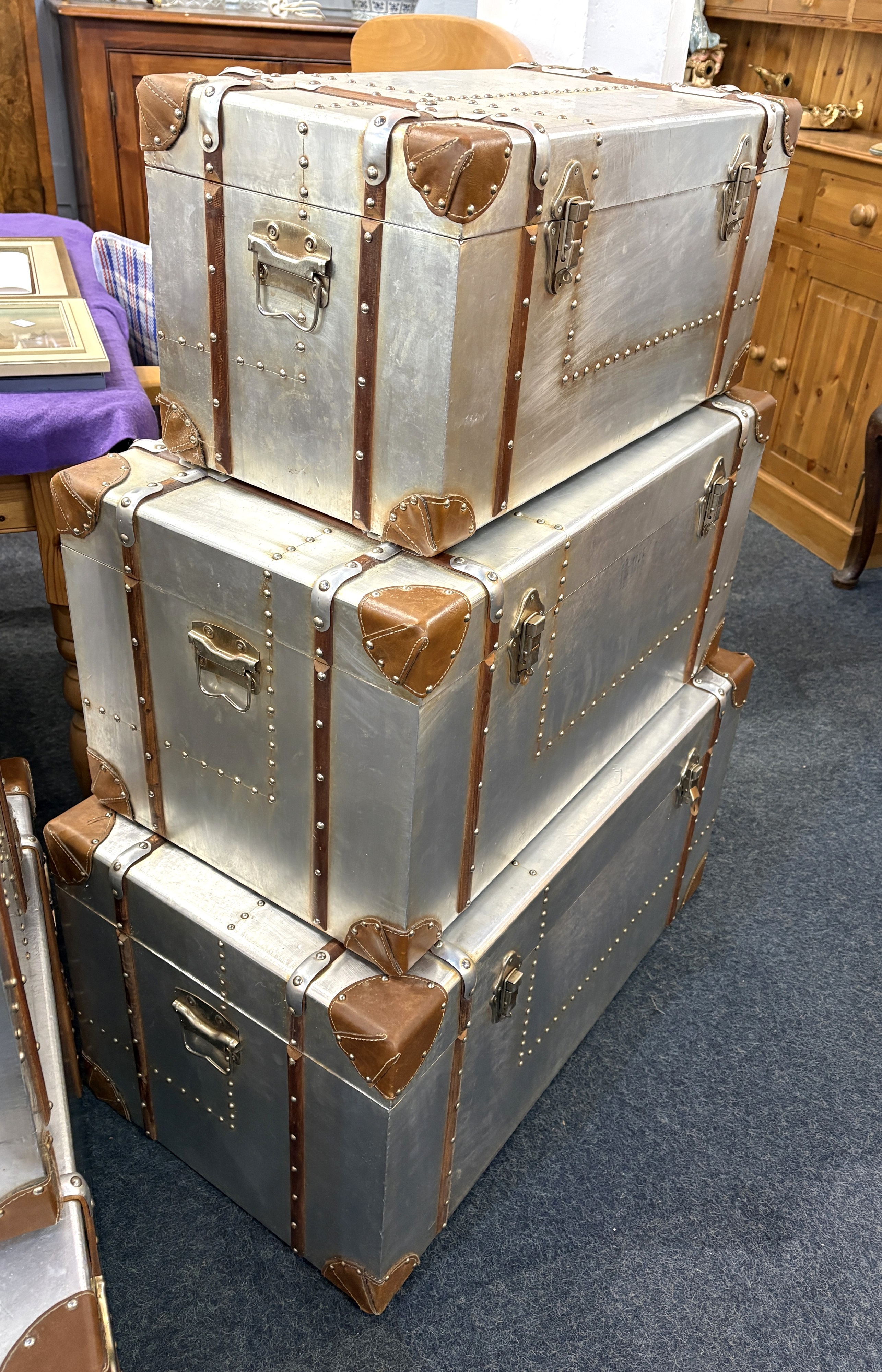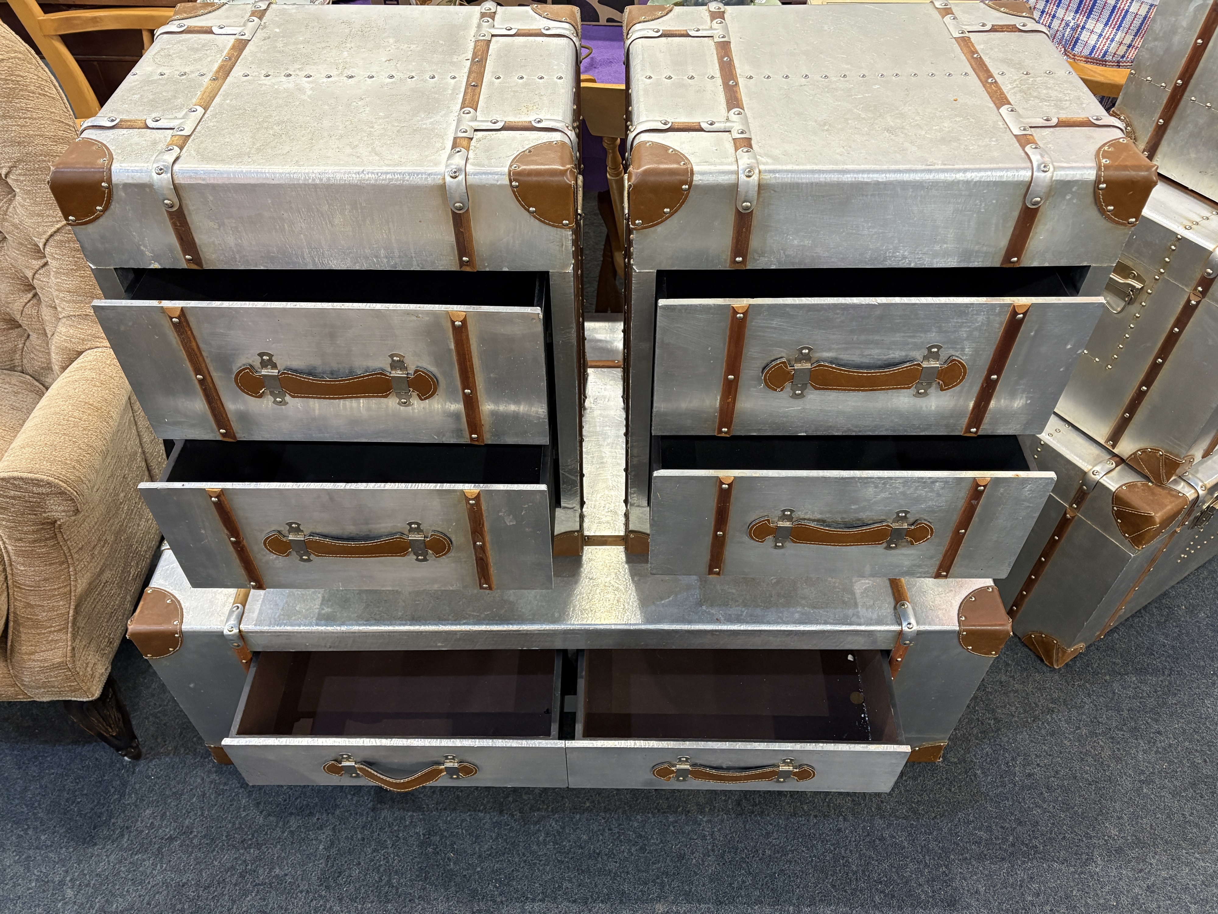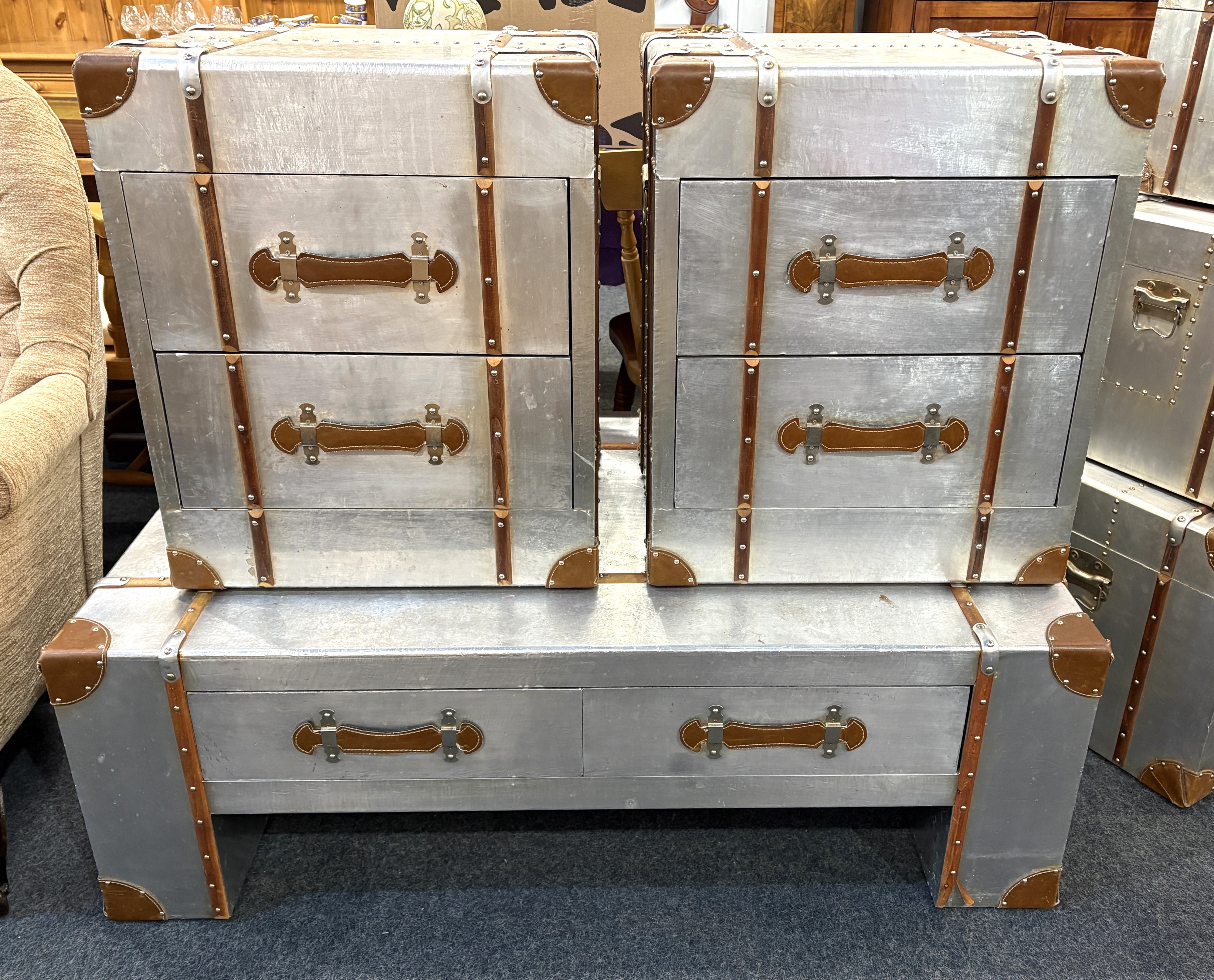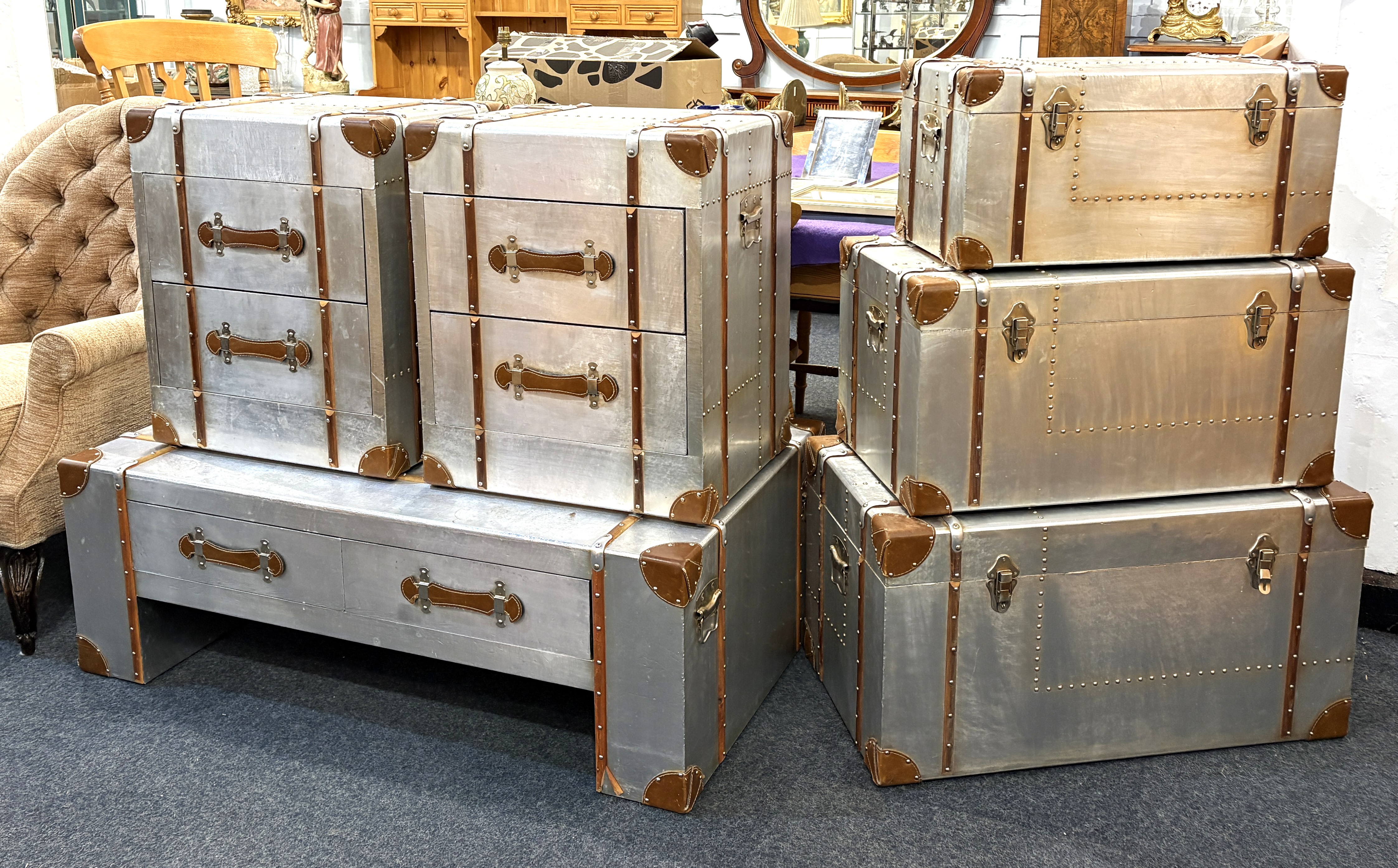A suite of aviation style furniture: comprising a low coffee table fitted with four drawers (121cm long by 70cm wide by 41cm high), a pair of bedside chests / side tables, each fitted with two drawers (51cm wide by 44cm deep by 61cm high), and a set of three graduated storage trunks with hinged lids (largest 81cm wide by 46cm deep by 43cm high) - all with wooden and leather mounts to the aluminium bodies, (6).