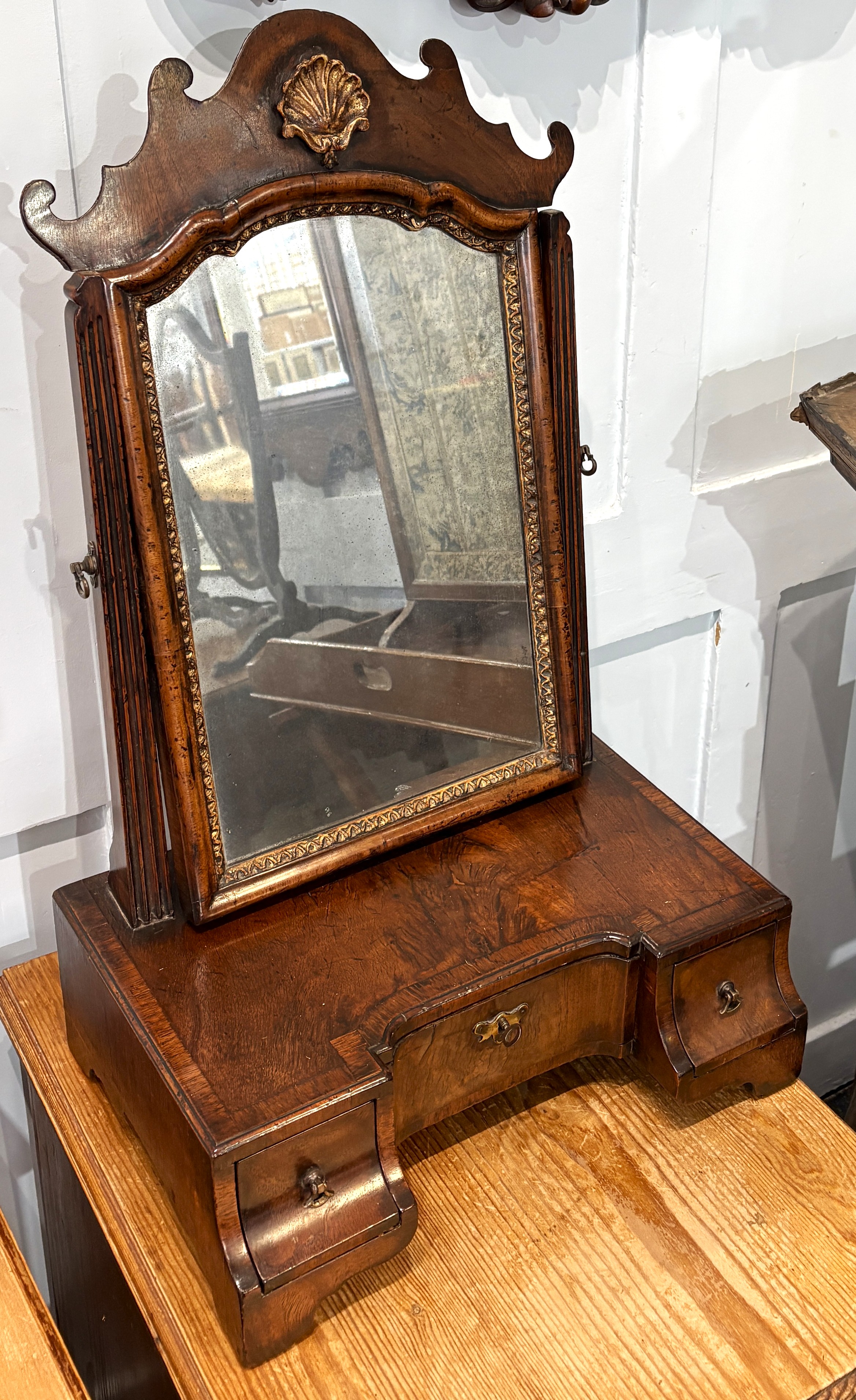 A Queen Anne style dressing table mirror in moulded frame, the fret cut surmount with gilt shell, the box base fitted with three drawers on bracket feet, height 69cm, width 40.5cm