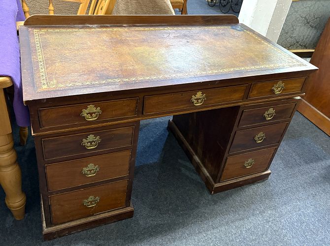A late 19th century mahogany pedestal desk with gilt tooled leather inset rectangular top above an arrangement of nine drawers, height 75cm, width 123cm, depth 62.5cm