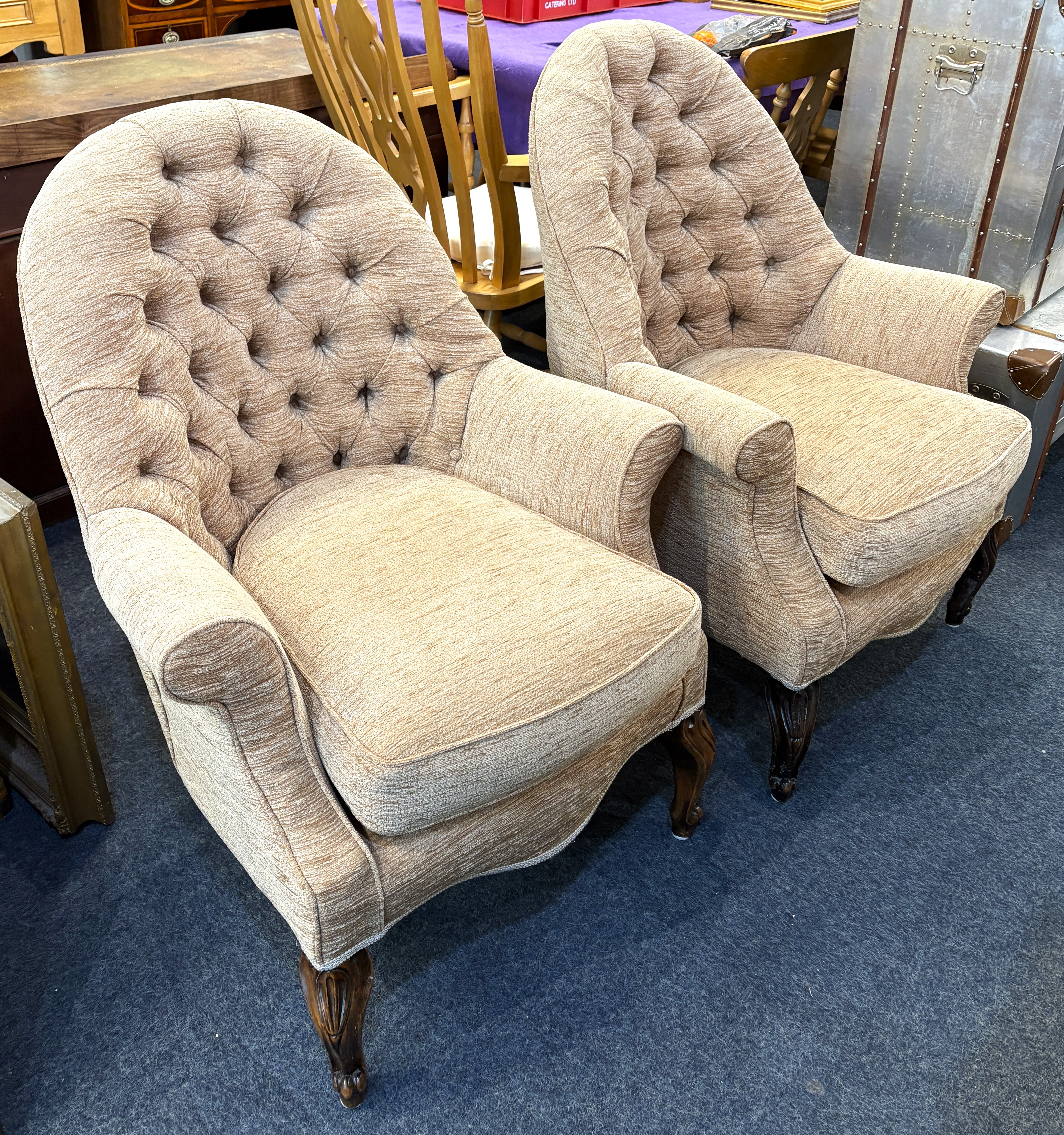 A pair of buttoned back armchairs in the 19th century style, nicely upho;stered in a good quality hard wearing fabric, loose seat cushions, raised on front hoof feet.