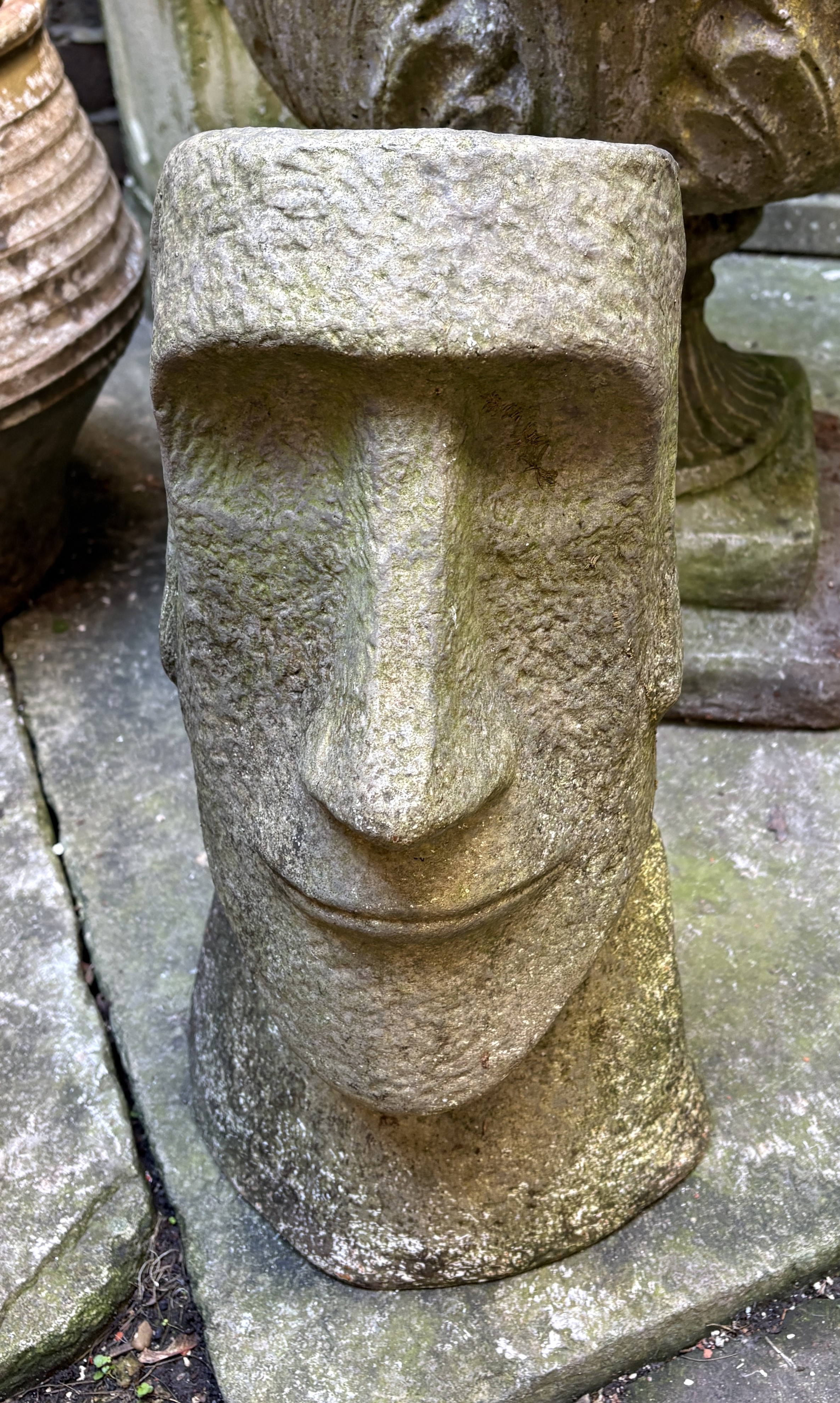 A terracotta garden ornament in the form of an Easter Island Head, 45cm high.