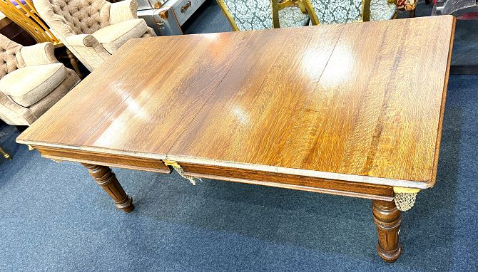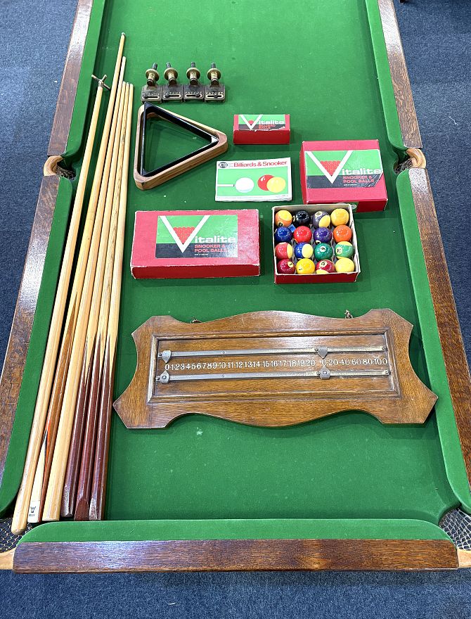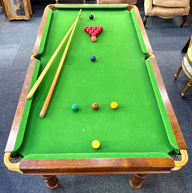 An Edwardian Riley oak snooker / dining table, with slate top, four leaves, fluted solid legs, and accessories to include score board, snooker, billiard and pool balls, cues, rest, triangles, chalk, and rule book - 198cm by 106cm (6'6" x 3'6").