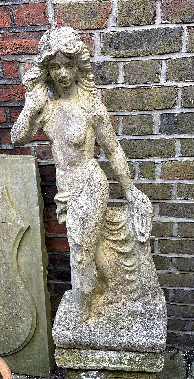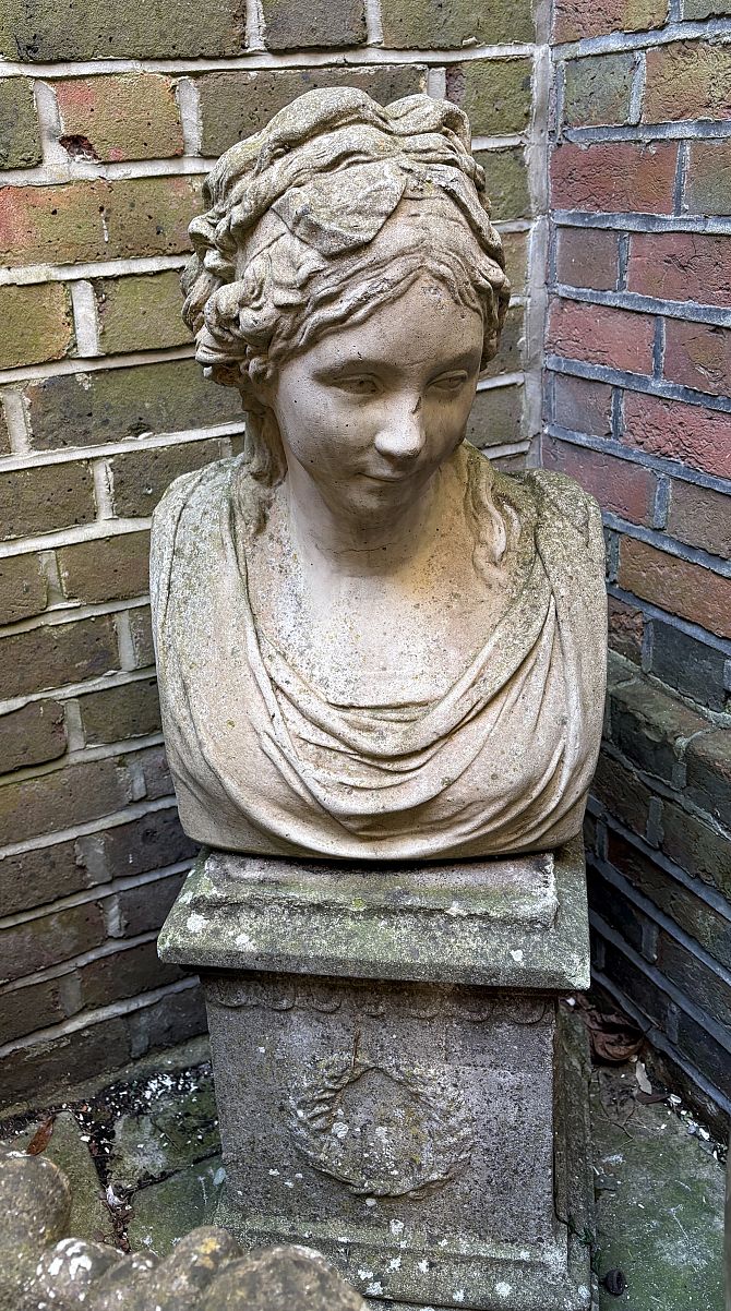A weathered reconstituted stone garden ornament in the form of a classical maiden bust, together with a matched plinth, combined height 93cm.