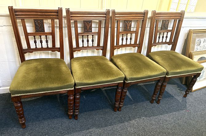 A set four Arts & Crafts walnut dining chairs, late 19th century, with upholstered seats.