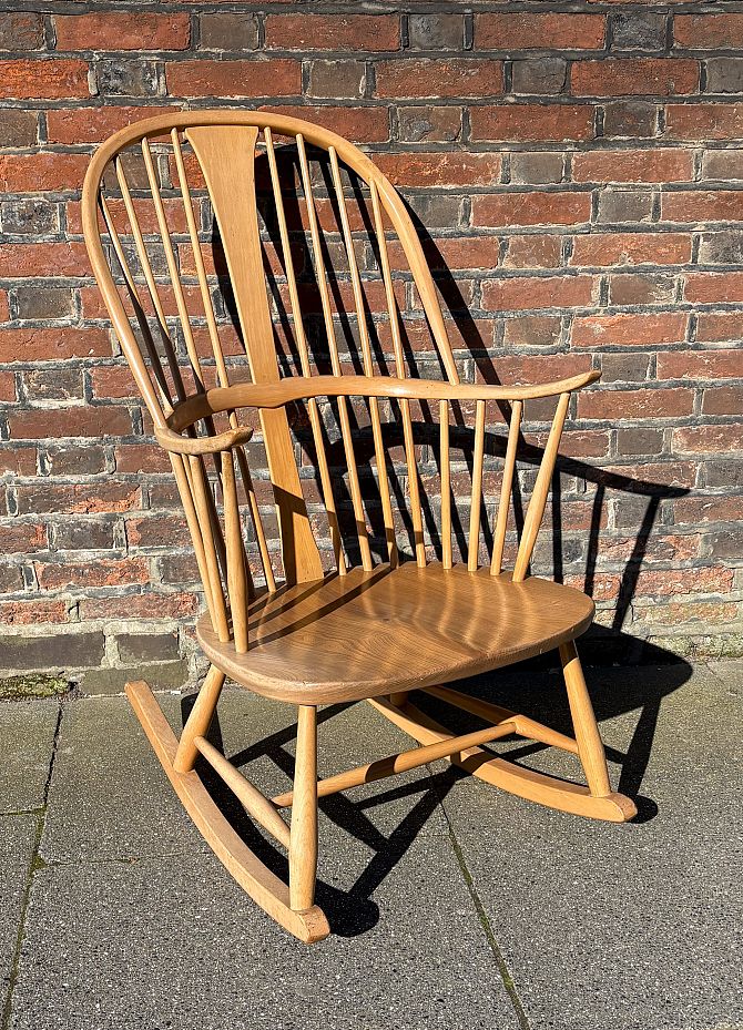 An Ercol cow horn rocking chair, in blond beech and elm, with high hooped spindle back, Ercol label to base, 102cm high
