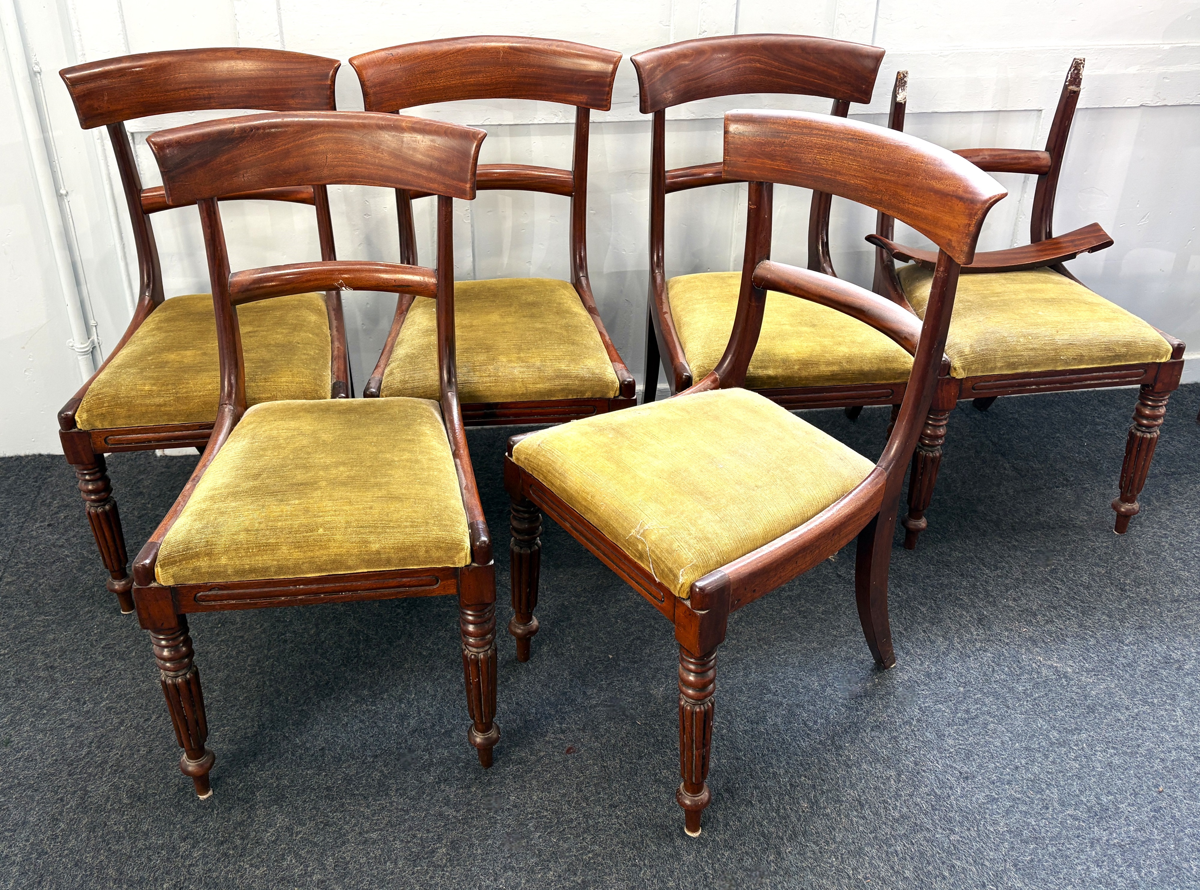 Six Victorian mahogany bar back dining chairs with green upholstered drop-in seats on turned and reeded front legs (a/f)