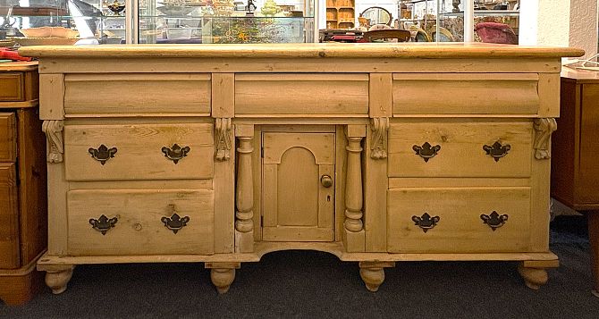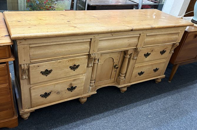A Victorian stripped pine dresser base, featuring three hidden frieze drawers above a central recessed panelled cupboard door, flanked by twin pillars, scrolled carved brackets and four further drawers, raised on turned bun feet, 175cm wide by 53cm deep by 84cm high.