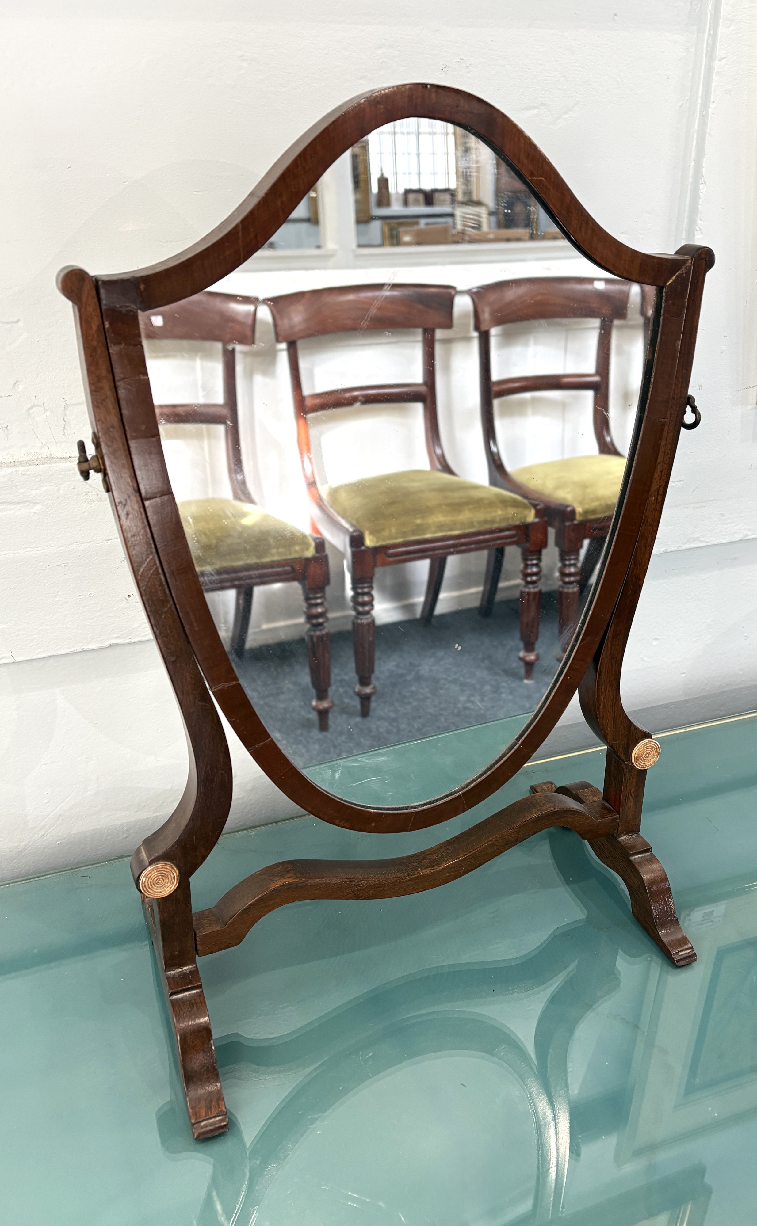A George III style mahogany shield shaped toilet mirror, height 46cm, width 32cm