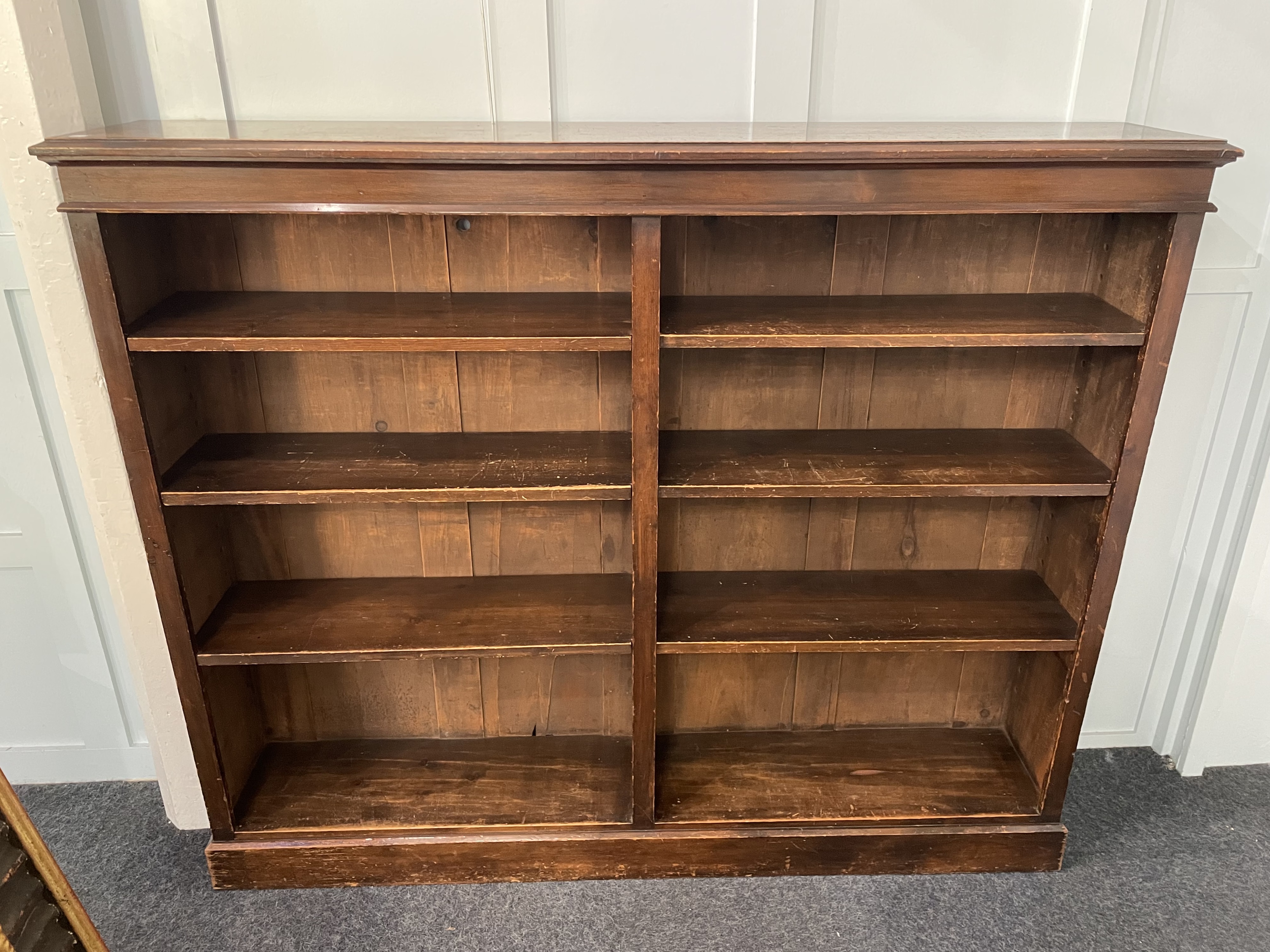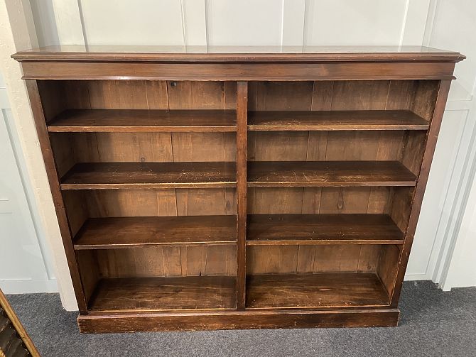 A 19th century walnut open front low bookcase, fitted with six adjustable shelves, raised on a plinth base, 168cm wide by 32cm deep by 140cm high.