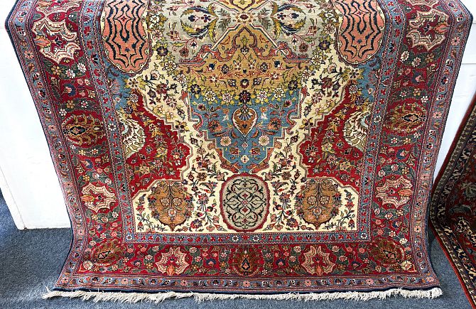 A good quality Persian rug, Kashmar, early / mid 20th century, traditional designs and colours within multi borders, approx 7'4" by 4'6".