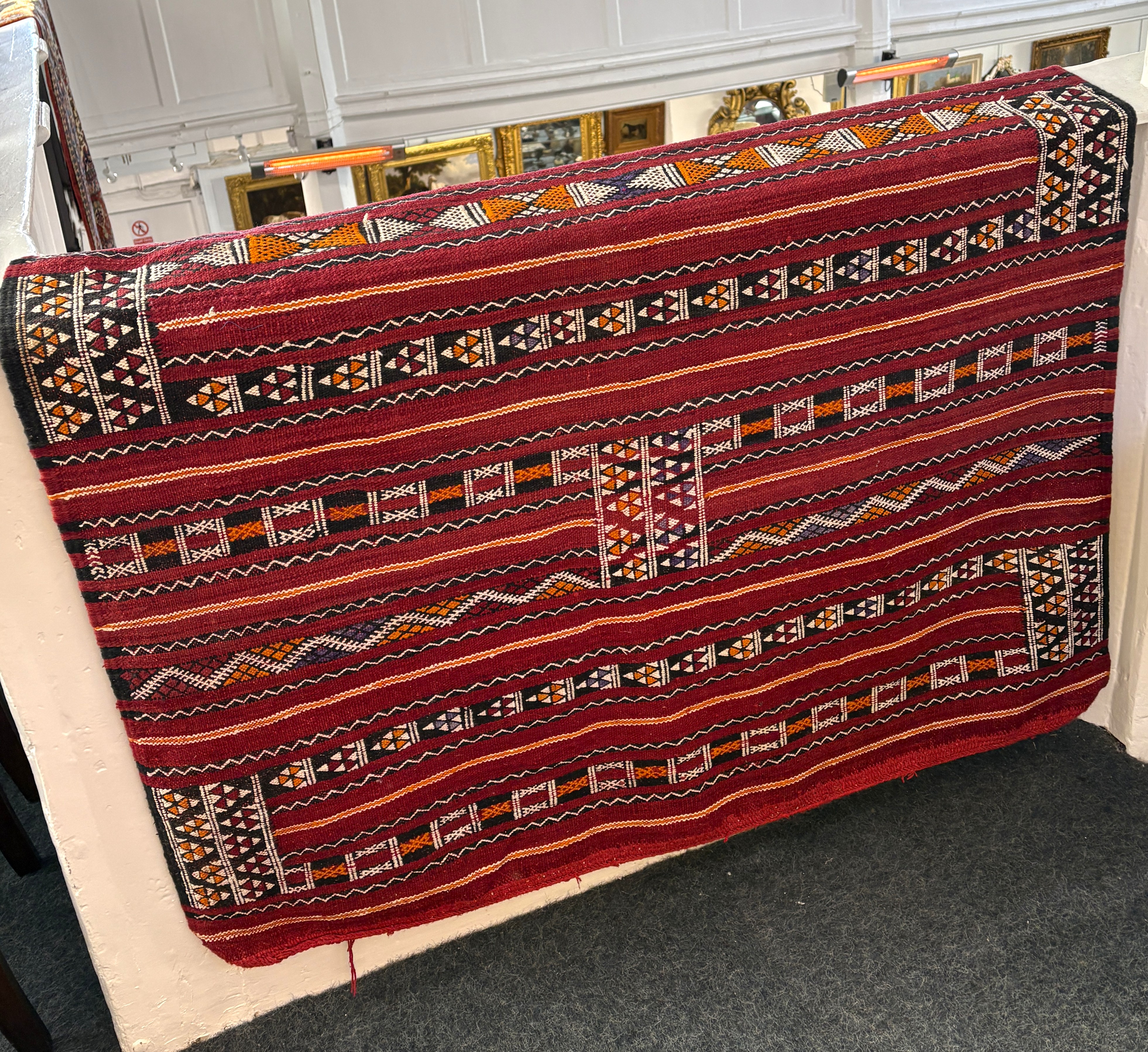 A Moroccan Kilim rug, red ground and traditional designs, 168cm by 117cm (5'6" x 3'10").