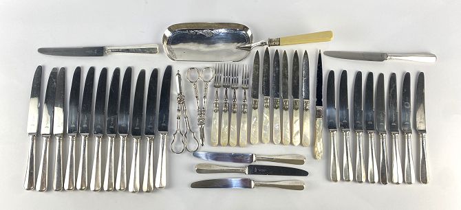 A silver plated crumb scoop with faux ivory handle, together with a collection of silver plated cake knives and forks with mother of pearl handles, a pair of Mappin & Webb silver plated grape scissors and other items