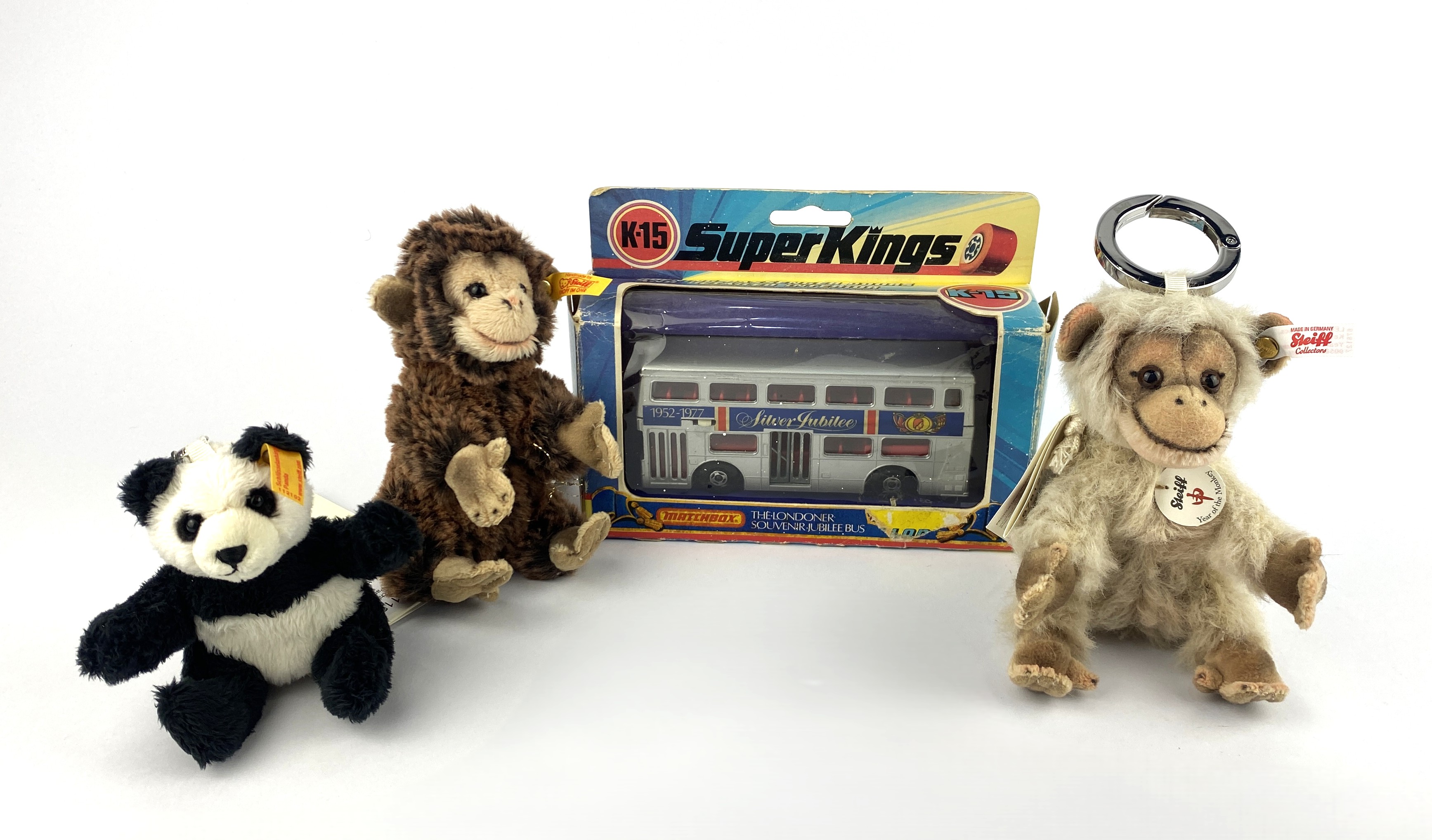 A Steiff Zodiac 'Year of the Monkey' key ring, white ear tag 678127, with paper chest tag and body tags, with original box, two Steiff bag charms comprising 'Jocko Monkey', yellow ear tag 112263, paper tag, and 'Panda', yellow ear tag 112102, paper tags, and a boxed Matchbox SuperKings 'The Londoner Souvenir Jubilee Bus'