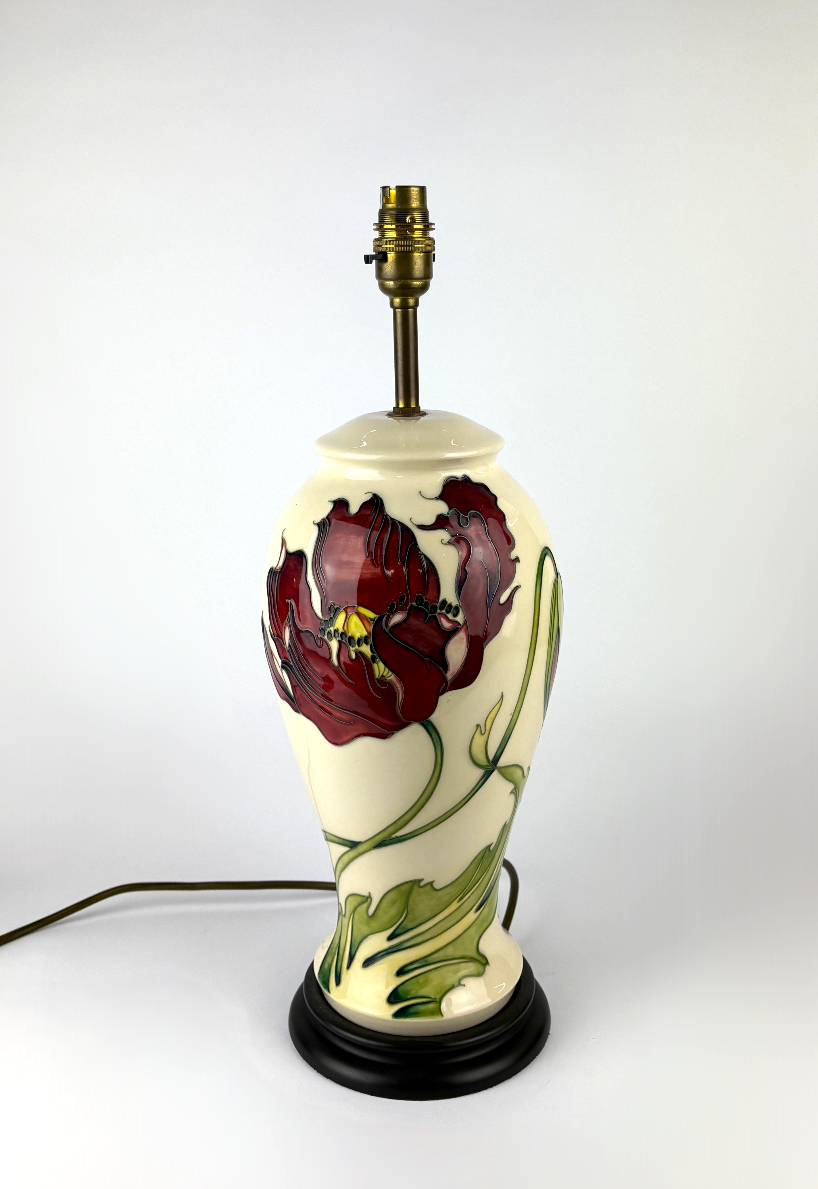 A Moorcroft 'Dancing Flame' pattern table lamp, designed by Philip Gibson, on wooden base, with original retailers labels, height 47cm