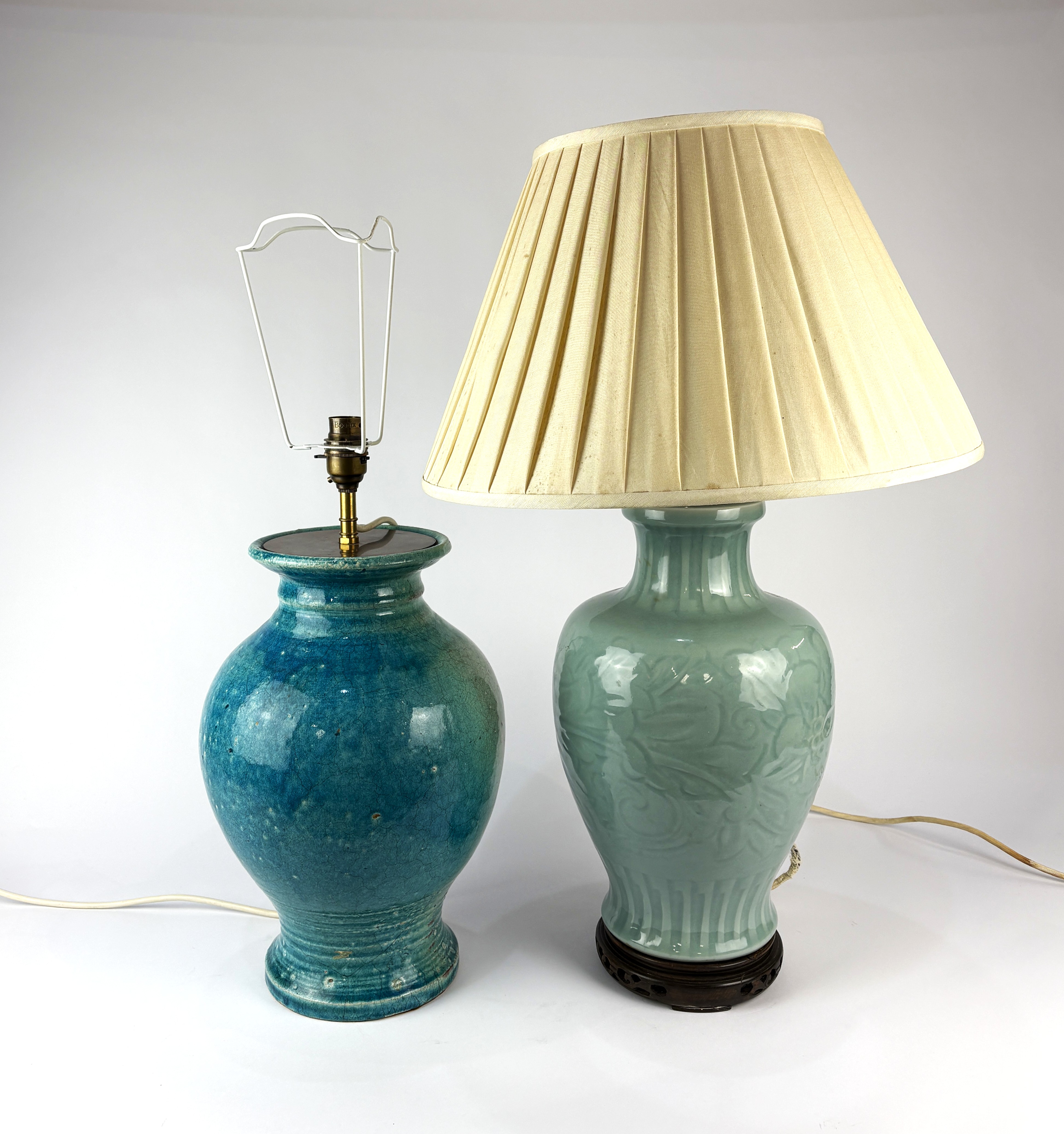 A Chinese celadon style ceramic table lamp base, decorated with floral motif, on hardwood base, with pleated silk shade, base height to fitting 39cm, together with a Chinese style turquoise crackle glazed table lamp base, with pleated silk shade, (shade AF) height 35cm, overall total height 72.5cm (2)