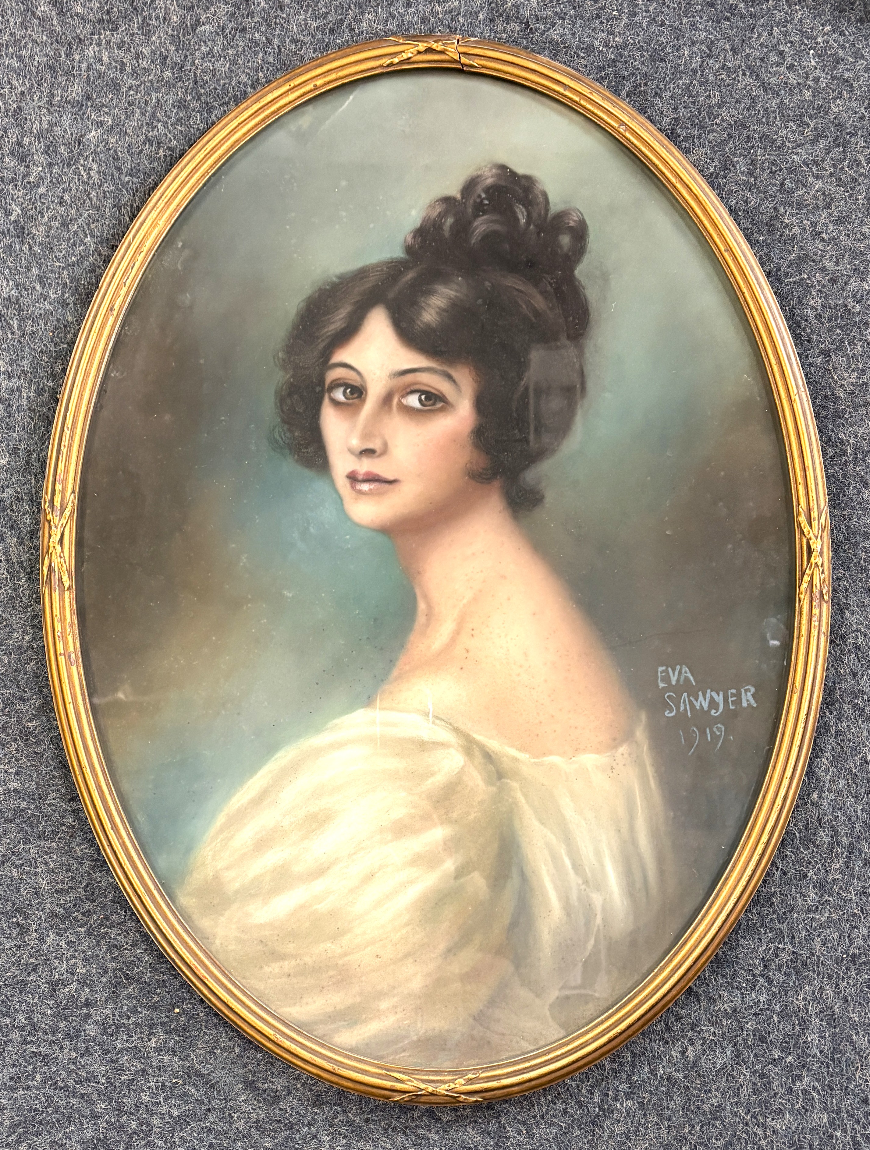 Eva Sawyer (British, 20th century) oval portrait of Edwardian style female sitter, pastel, signed and dated 1919, framed, 72cm x 51cm (AF)