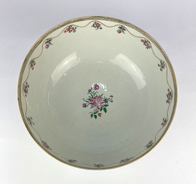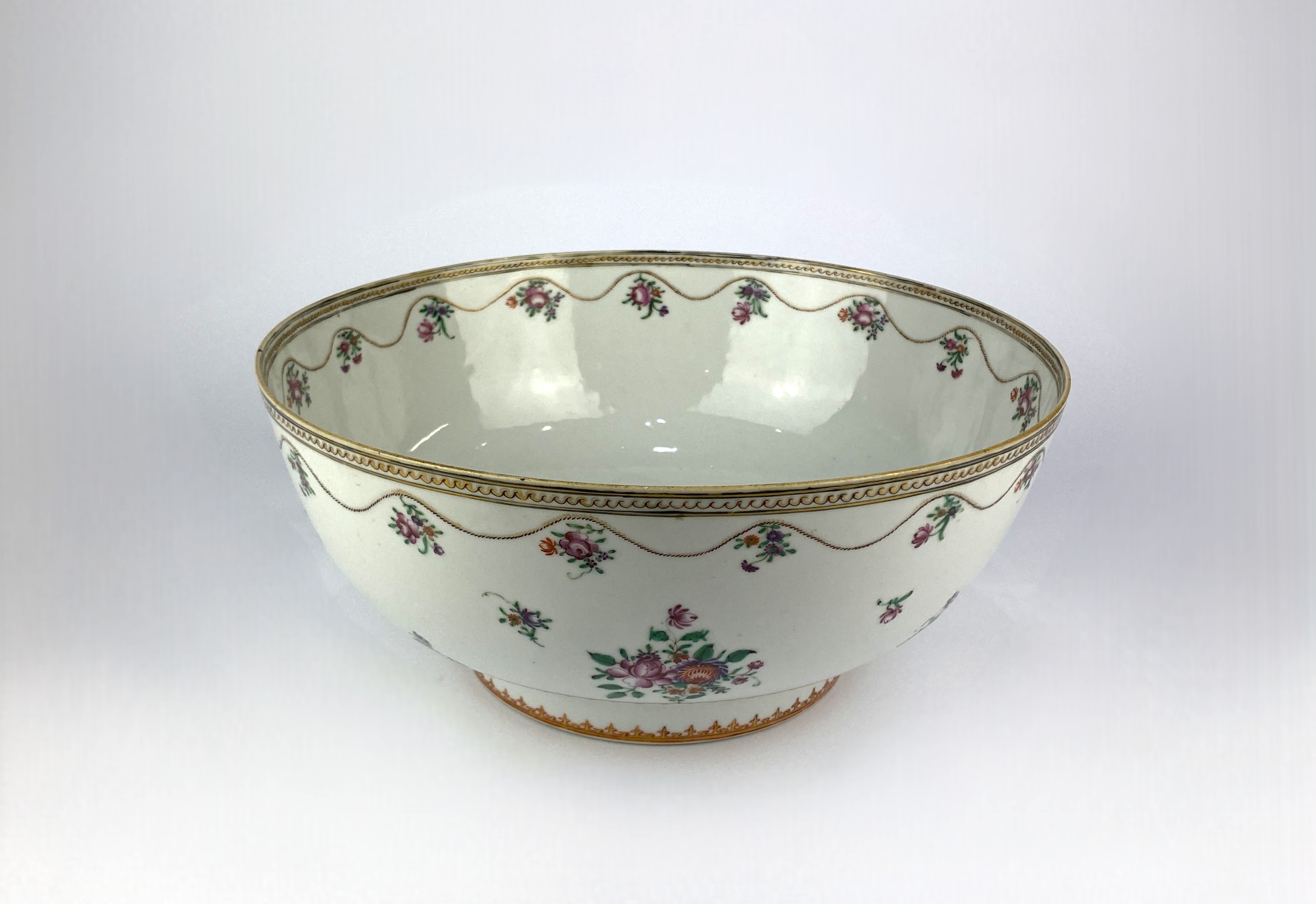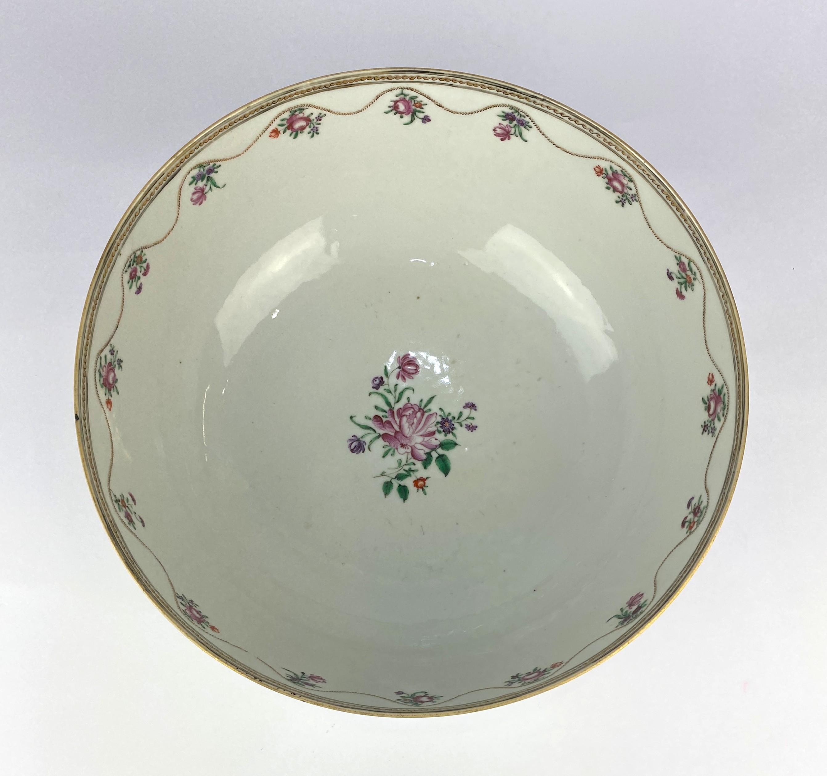 An 18th century Chinese famille rose porcelain punch bowl with floral decoration and gilt embellishments, height 12cm, diameter 28.5cm