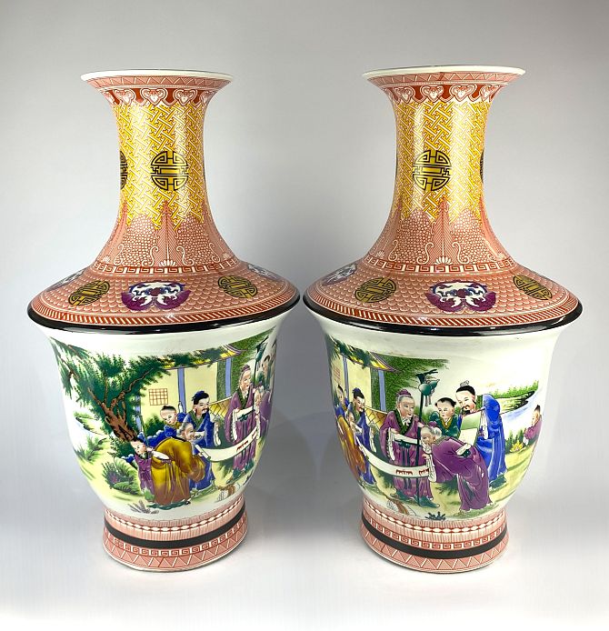 A pair of modern decorative Japanese porcelain vases with polychrome figurative decoration and four character mark to base 62cm high