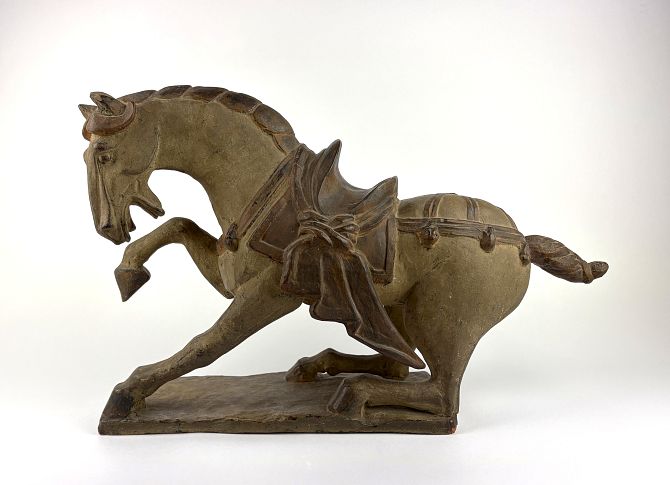 A Chinese ceramic model of a prancing horse, after the Tang Dynasty style, well modelled and with attractive patination, 52cm long by 33cm high.