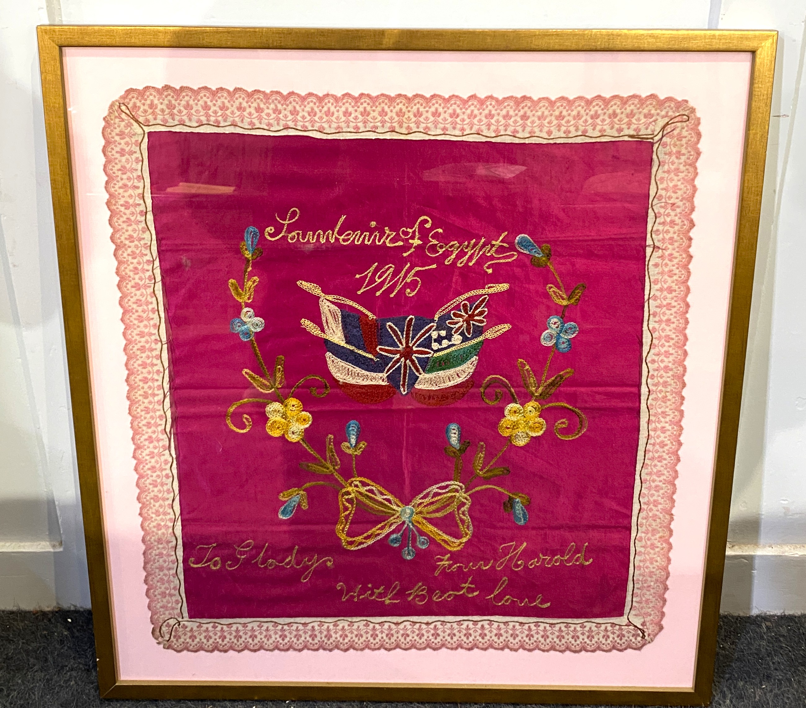 A WWI souvenir embroidery, 'Souvenier of Egypt 1915 To Gladys from Harold with best love', decorated with flags, flowers and ribbon, 54cm by 49cm, later framed.