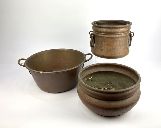 Three copper pots to include a two-handled jam pan 37cm wide including handles