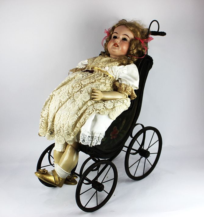 A large German bisque headed doll, possibly by Armand Marseille, stamped to back of head A17M, with open mouth, blonde wig, brown glass eyes (one AF), jointed composition body, with white cotton dress and bloomers with cream lace overdress, height 80cm, together with a Victorian style dolls pram, painted with floral decoration, height 76cm (2)