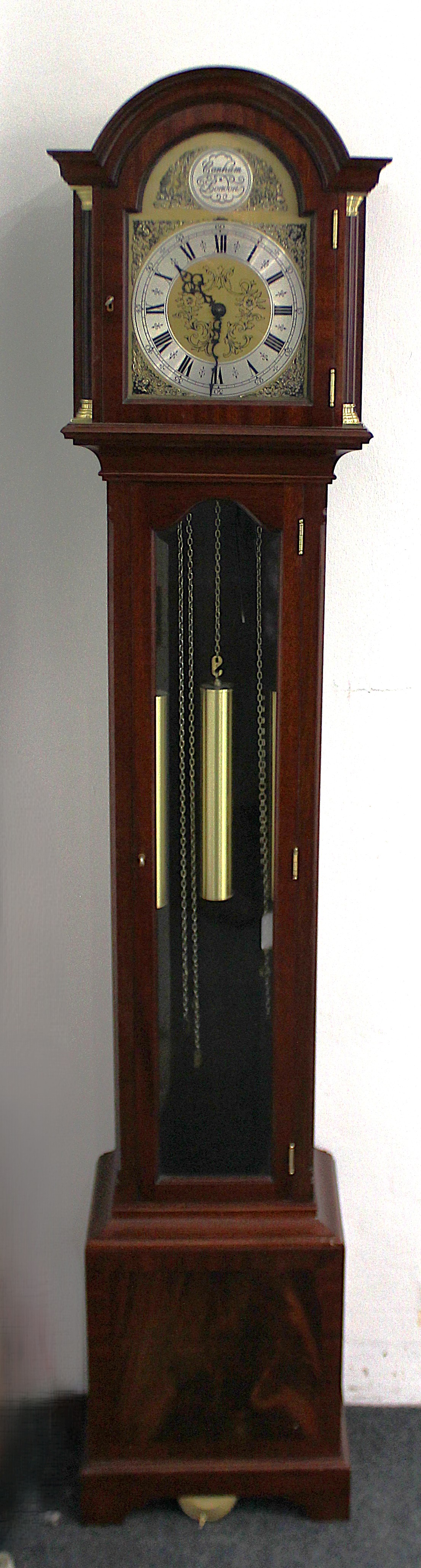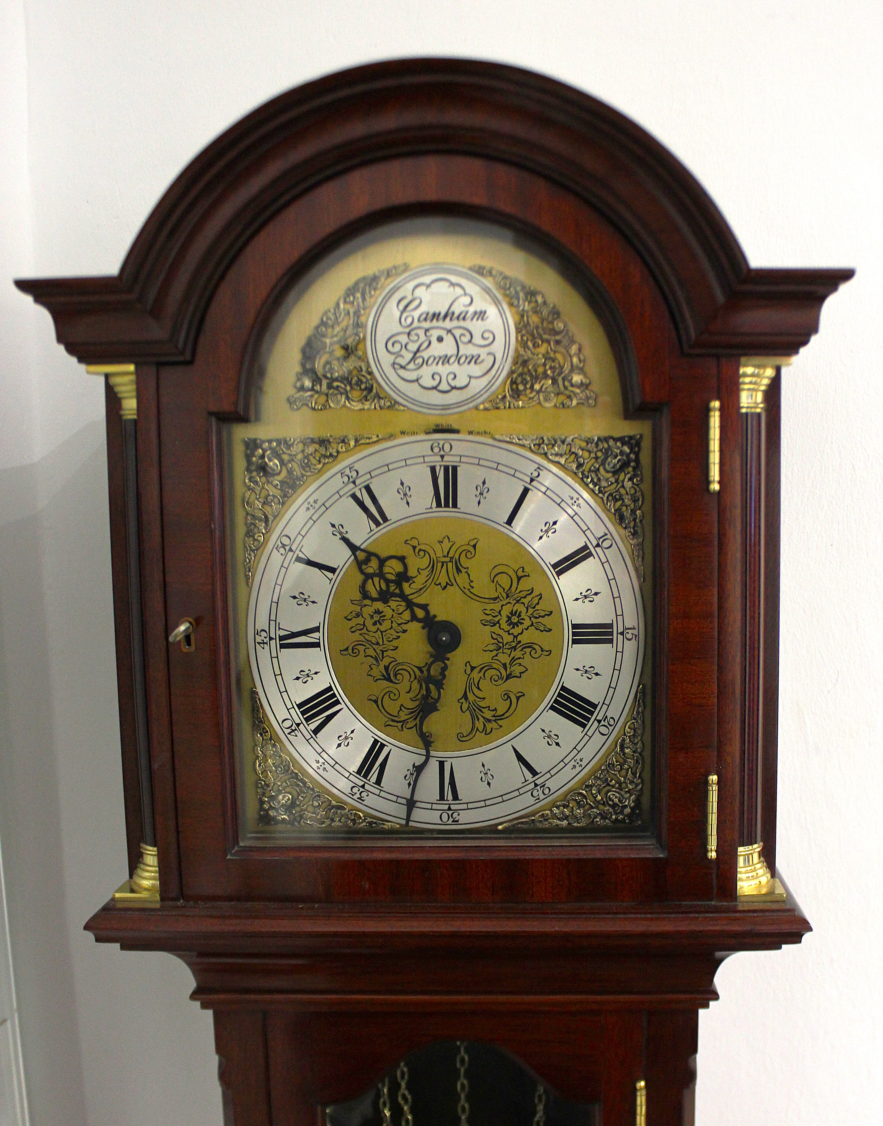 A good quality reproduction Georgian style chiming Grandmother clock by Canham of London, with Westminster, Whittington and Winchester chimes, complete with three brass finished weights and pendulum, 173cm high.