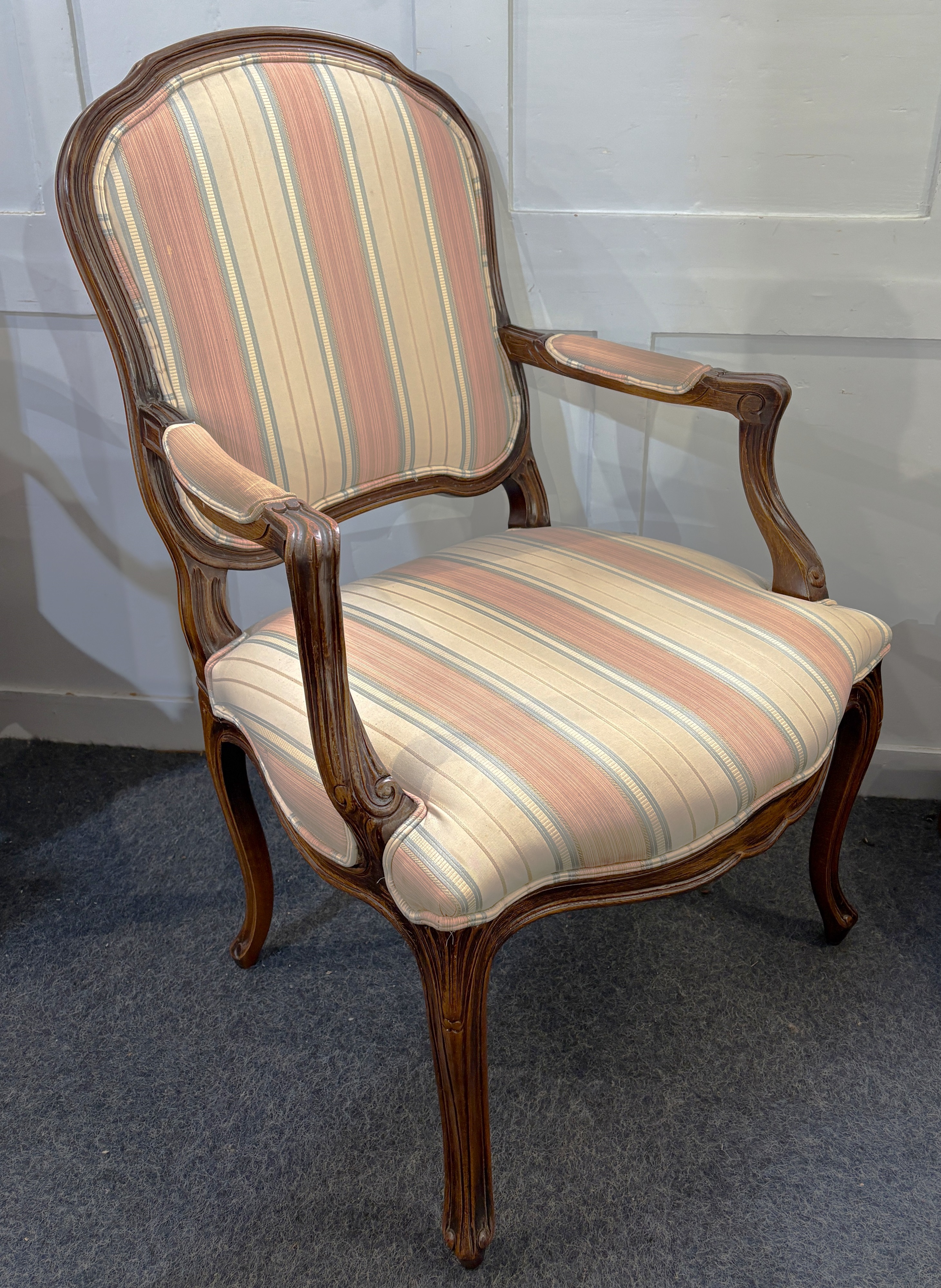 A fauteuil armchair with shaped padded back within a moulded frame, open scrolling arms, and upholstered seat, on cabriole legs