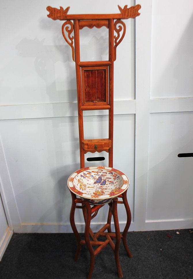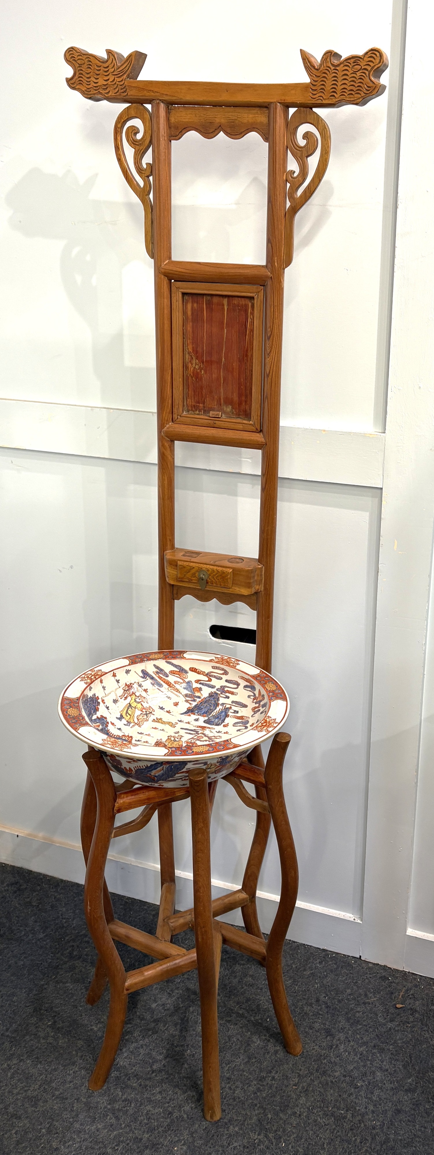 A Chinese wash stand, with small drawer, carved and pierced decoration on shaped supports 165cm high, together with an associated wash bowl with figural decoration in the Imari palette, 36.5cm diameter