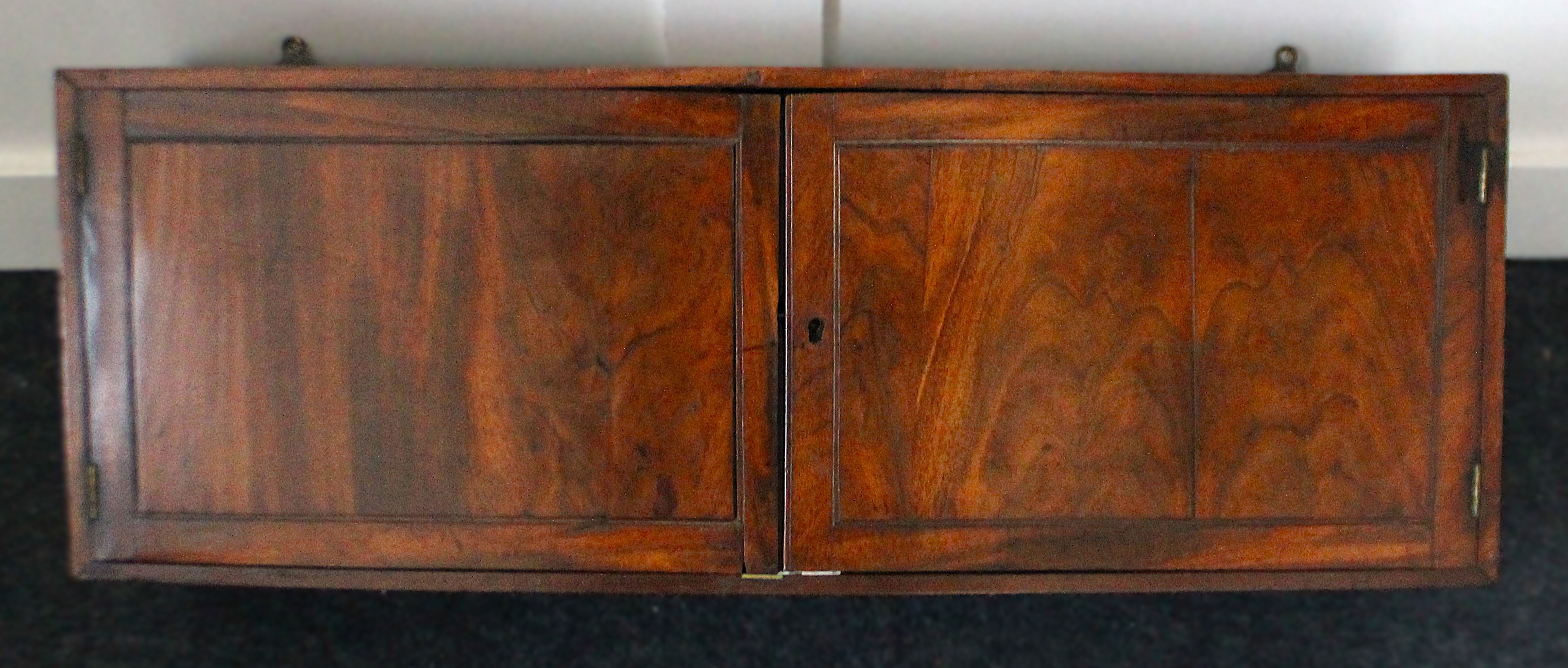 A 19th century rectangular walnut wall cabinet with two panel doors, 26cm high, 74cm wide, 20cm deep