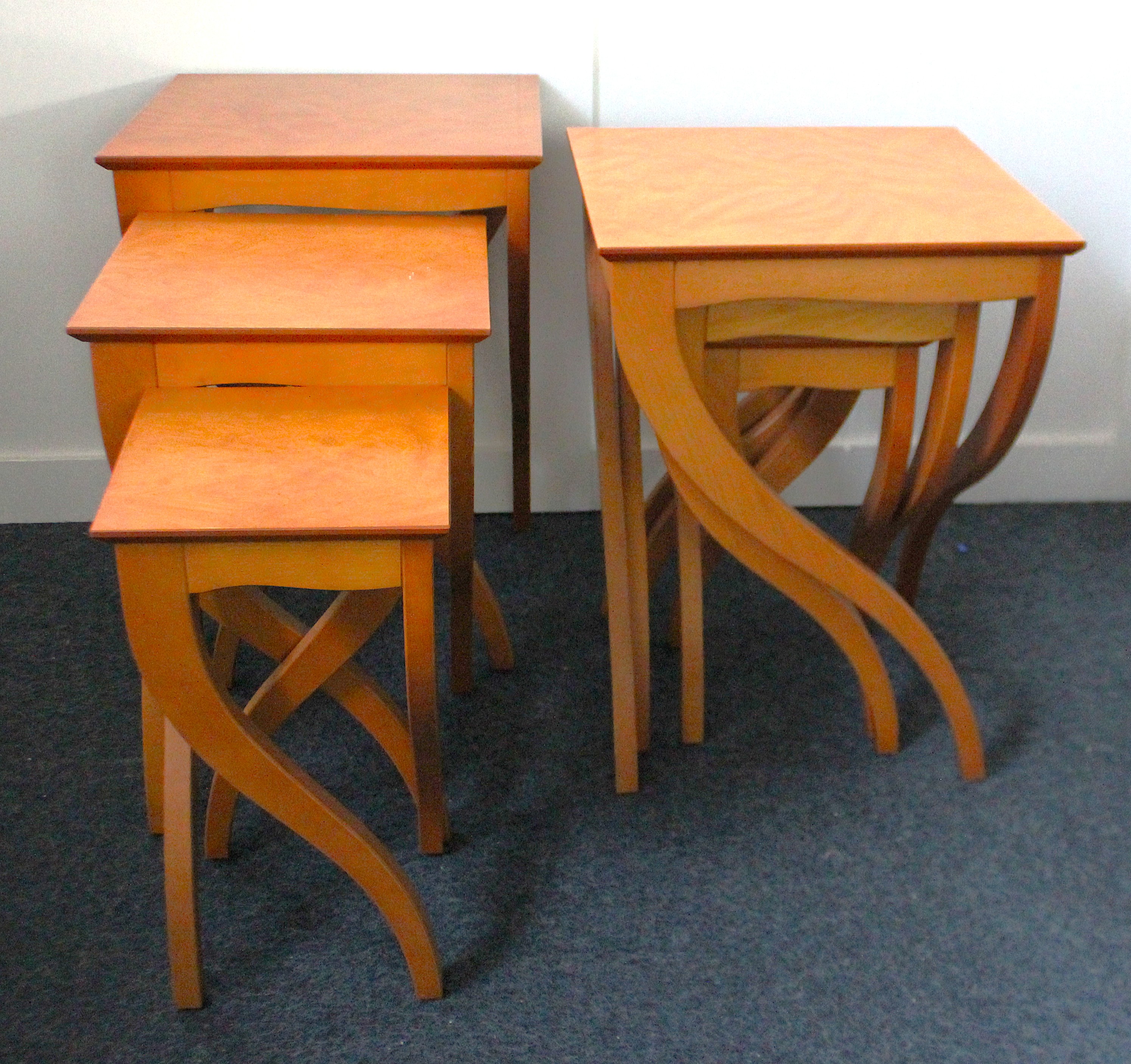 A pair of nests of three tables in the manner of Jaume Torras for Carabat, on inverted sabre legs largest table 61.5cm high, 45cm wide, 45cm deep
