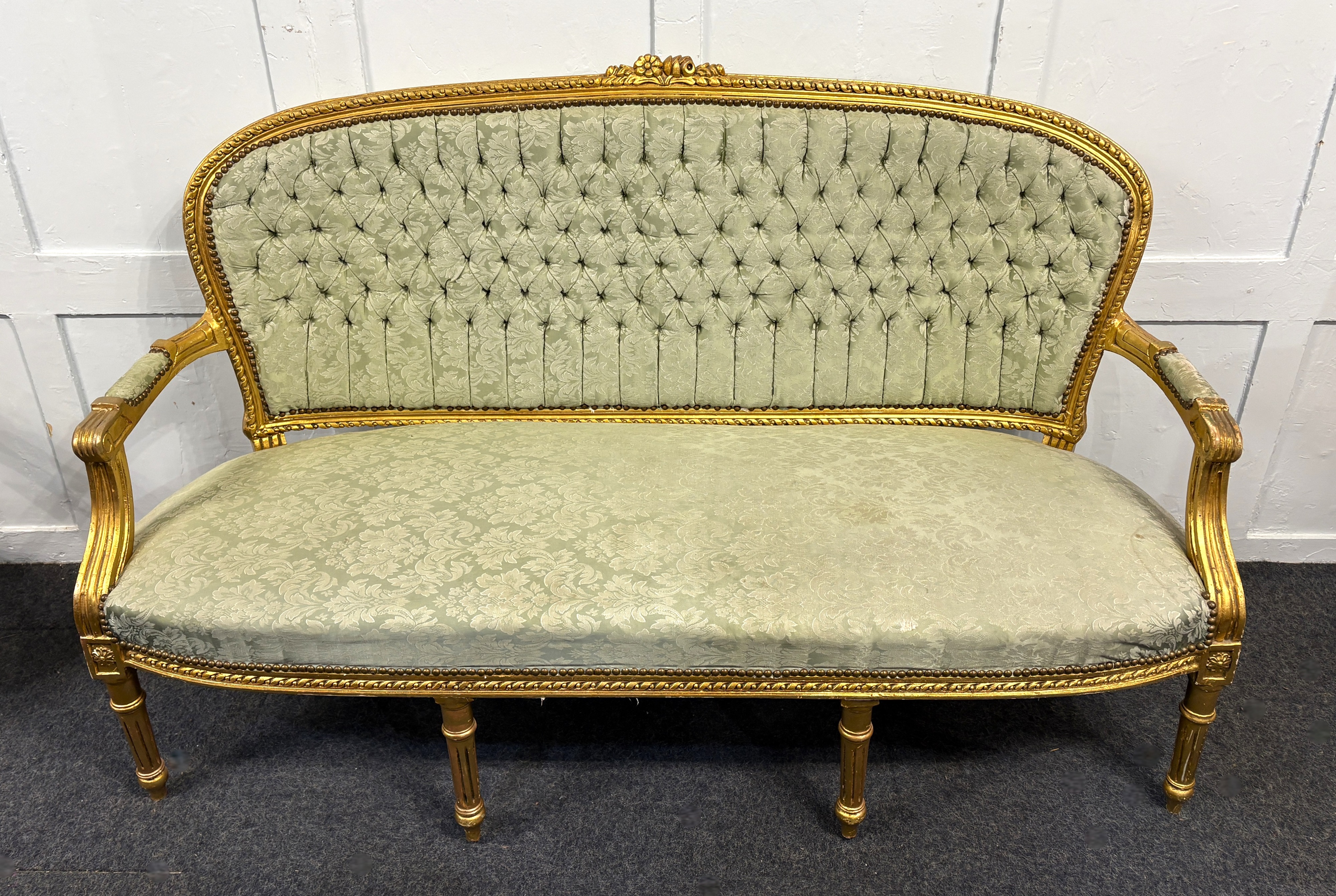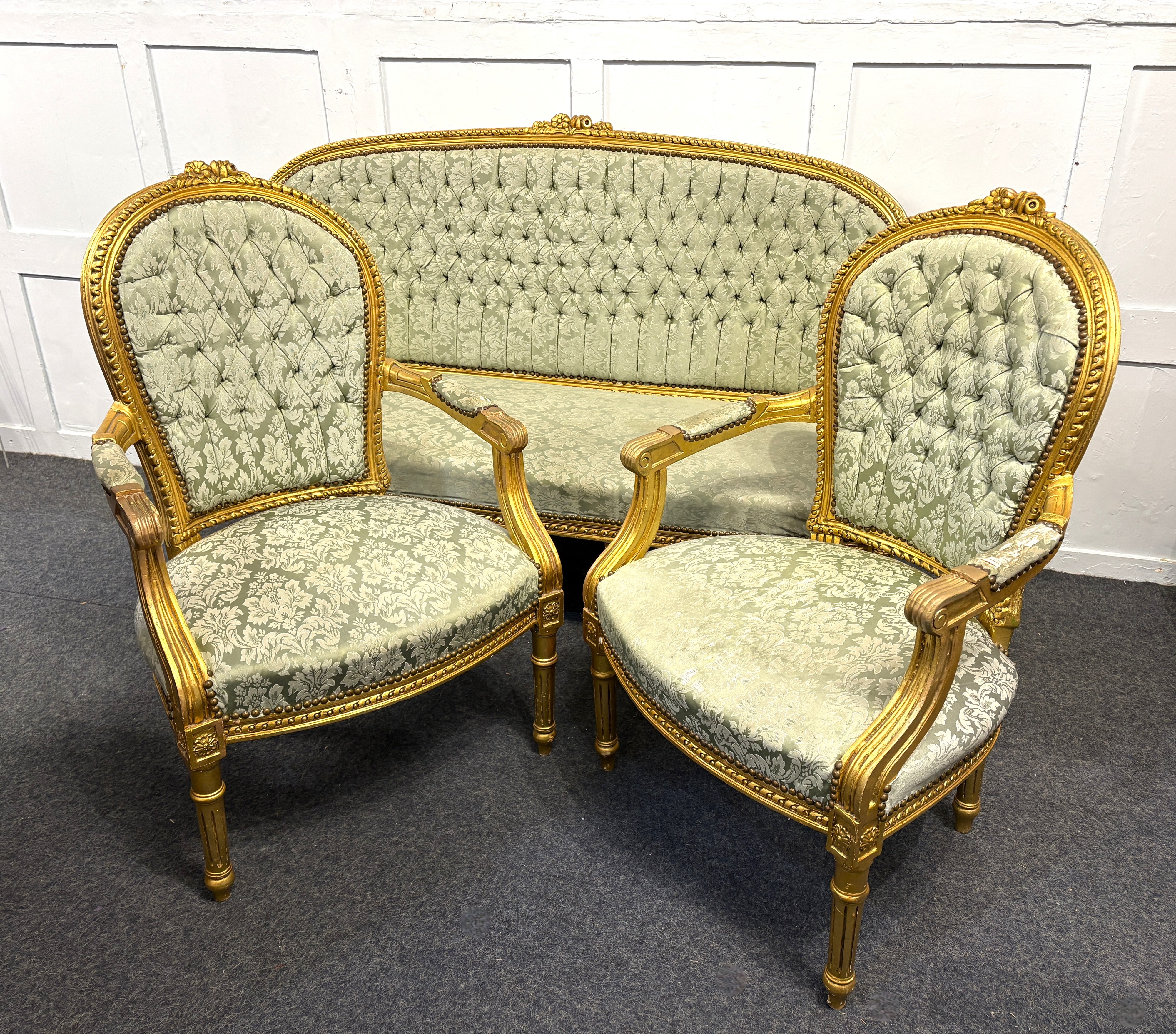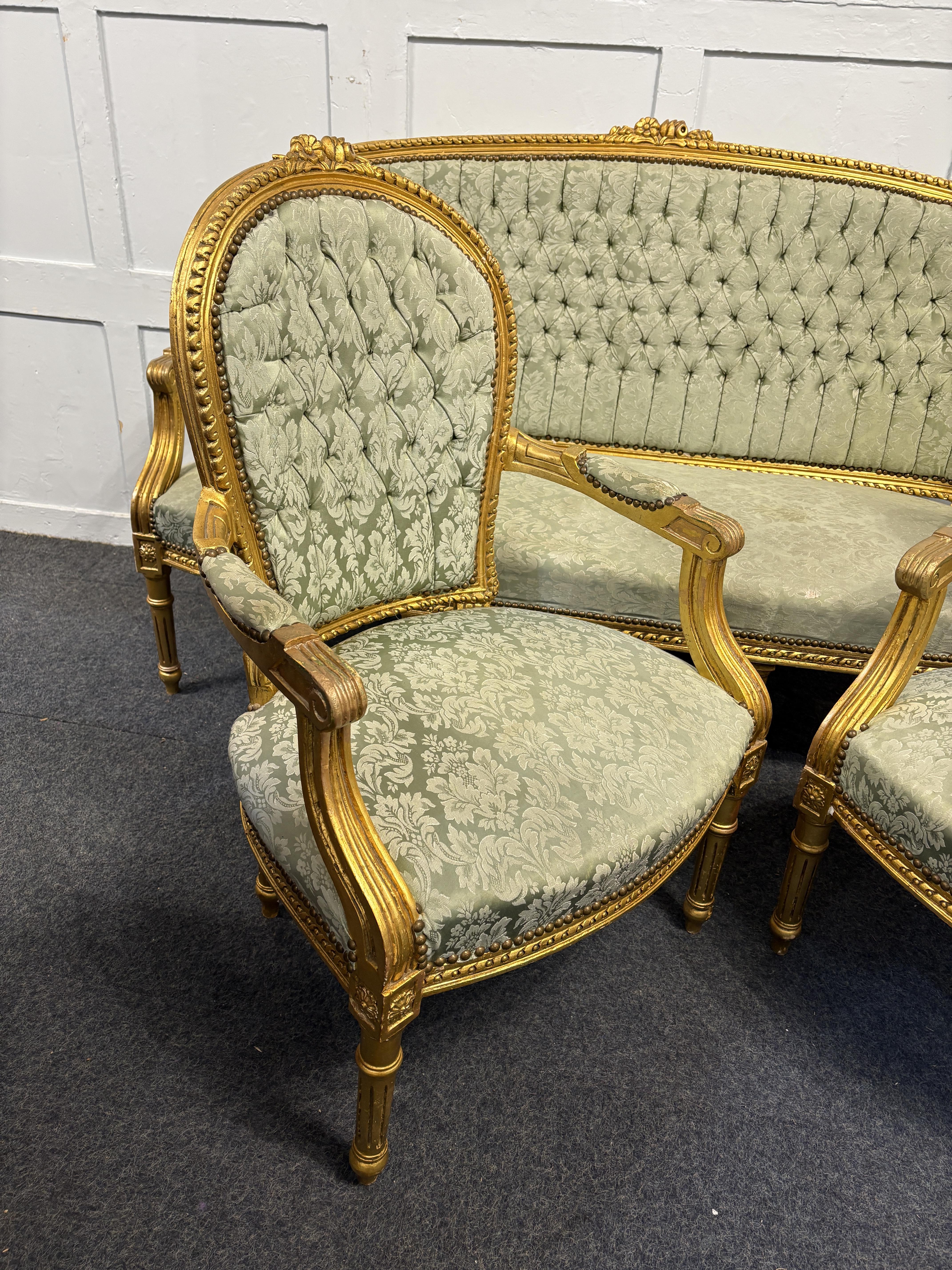 A vintage French giltwood three piece settee suite in the Louis XV style, 20th century, comprising a three seater settee and pair of open armchairs, sympathetically upholstered in a soft foliate design pale green fabric and buttoned backs, settee 191cm wide.