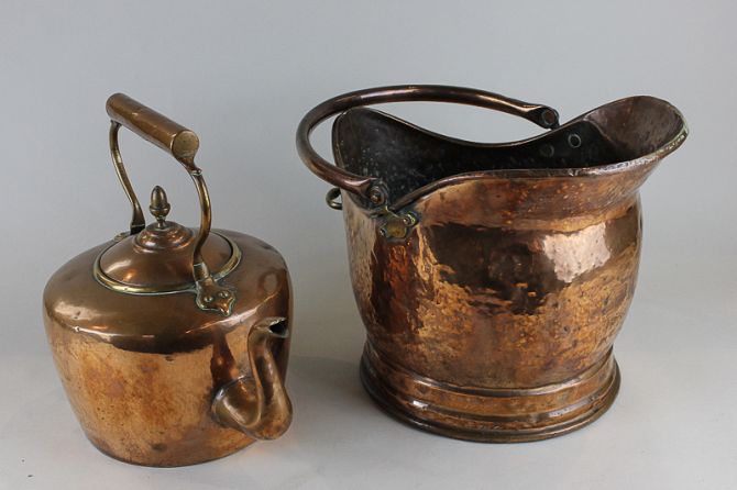 A copper helmet shaped coal scuttle and a 19th century copper kettle