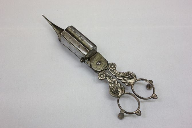 A pair of patented silver plated candle snuffers, stamped Hobday and Co.