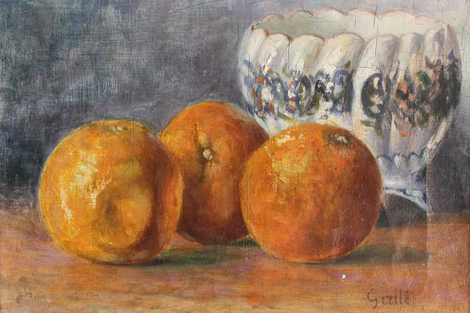 Guelle (20th Century) Still life of oranges, oil on canvas, signed, 21cm by 26cm