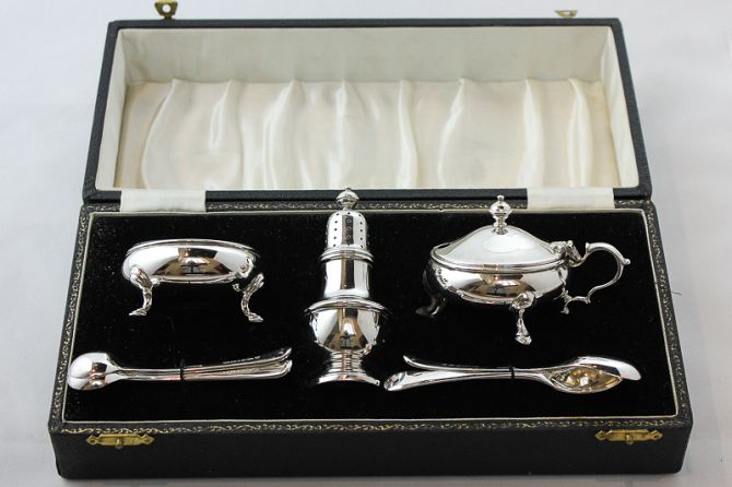 A cased modern silver three piece cruet set, makers Adie Brothers, Birmingham 1955, of salt, mustard pot and pepper and four plated salt and mustard spoons