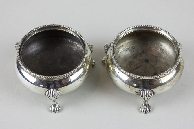 A pair of Victorian silver cauldron salts, maker John Aldwinckle and James Slater, London 1883, with beaded rims each on three sheel and paw feet, 7oz